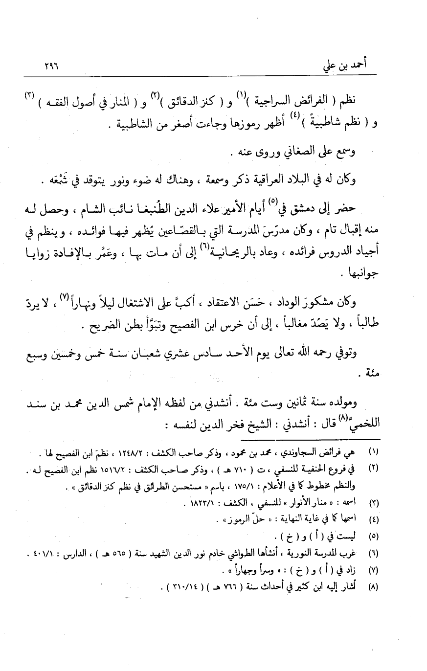 ومولده سنة ثمانين وست مئة. أنشدني من لفظه الإمام شمس الدين محمد بن سند اللخميَّ قال: أنشدني الشيخ فخر الدين لنفسه: