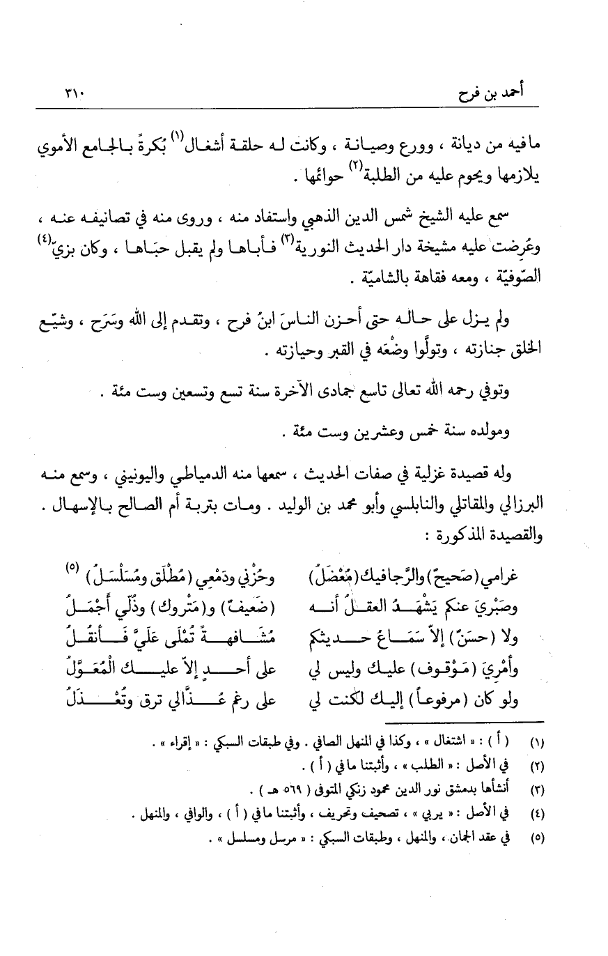 ولم يزل على حاله حتى أحزن الناسَ ابنُ فرح، وتقدم إلى الله وسَرَح، وشيّع الخلق جنازته، وتولّوا وضْعَه في القبر وحيازته.