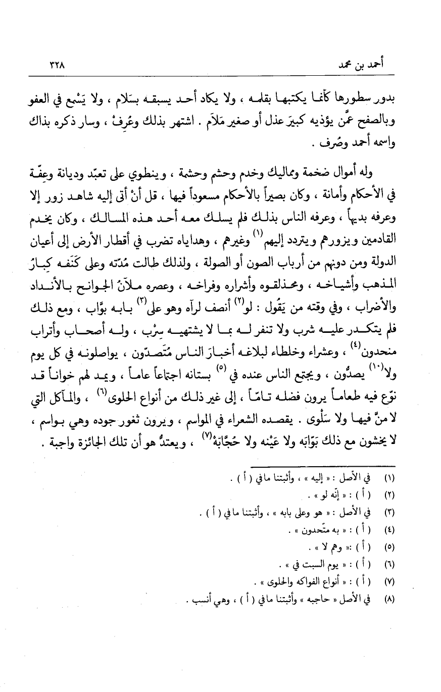 بدور سطور كأنما يكتبها بقلمه، ولا يكاد أحد يسبقه بسلام، ولا يسمع في العفو وبالصفح عمّن يؤذيه كبير عذل أو صغير مَلام. اشتهر بذلك وعُرف، وسار ذكره بذاك واسمه أحمد وصُرف.
