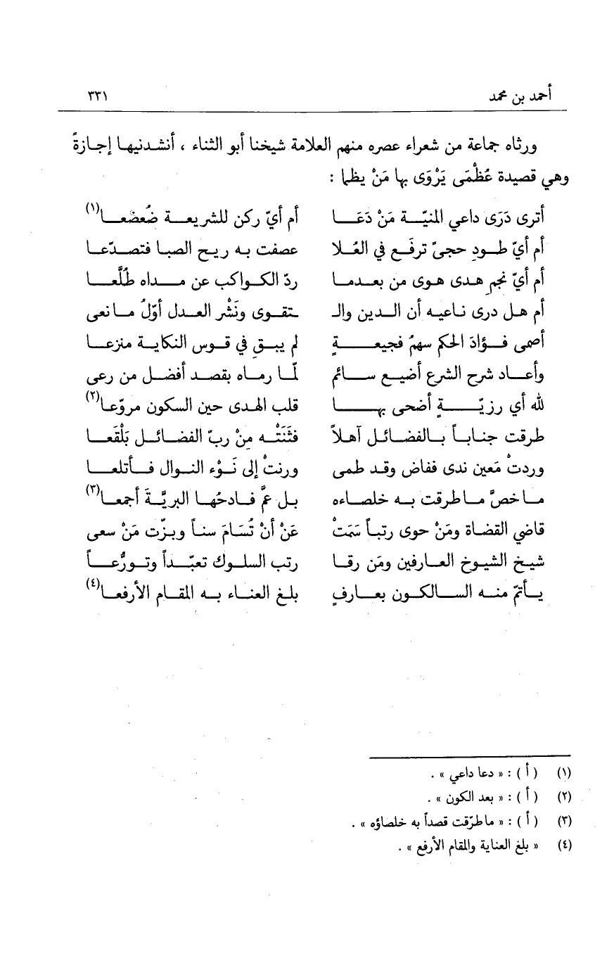 ورثاه جماعة من شعراء عصره منهم العلامة شيخنا أبو الثناء، أنشدنيها إجازة وهي قصيدة عُظمى يَرْوَى بها مَنْ يظما: