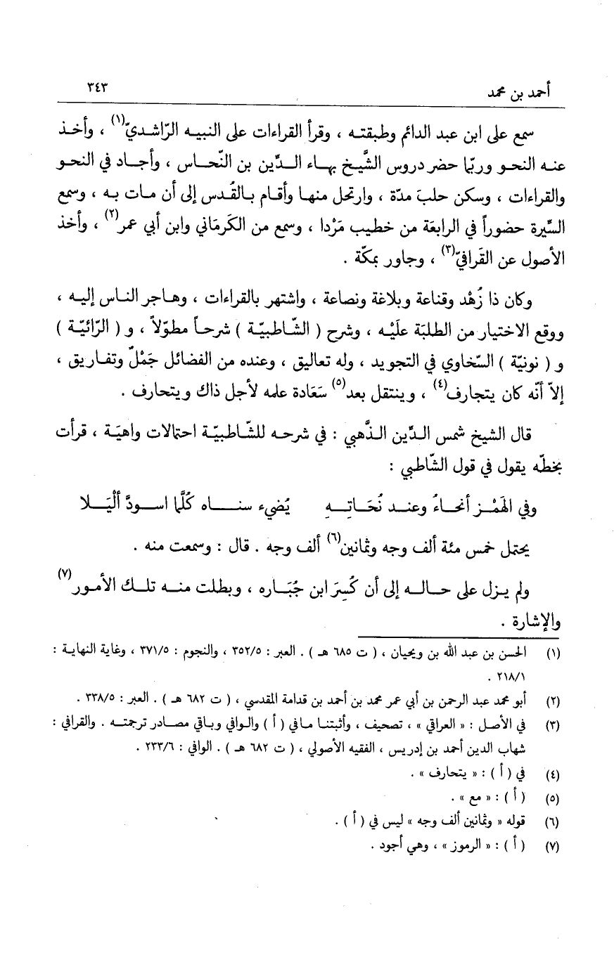 قال الشيخ شمس الدين الذهبي: في شرحه للشاطبية احتمالات واهية، قرأت بخطّه يقول في قول الشاطبي: