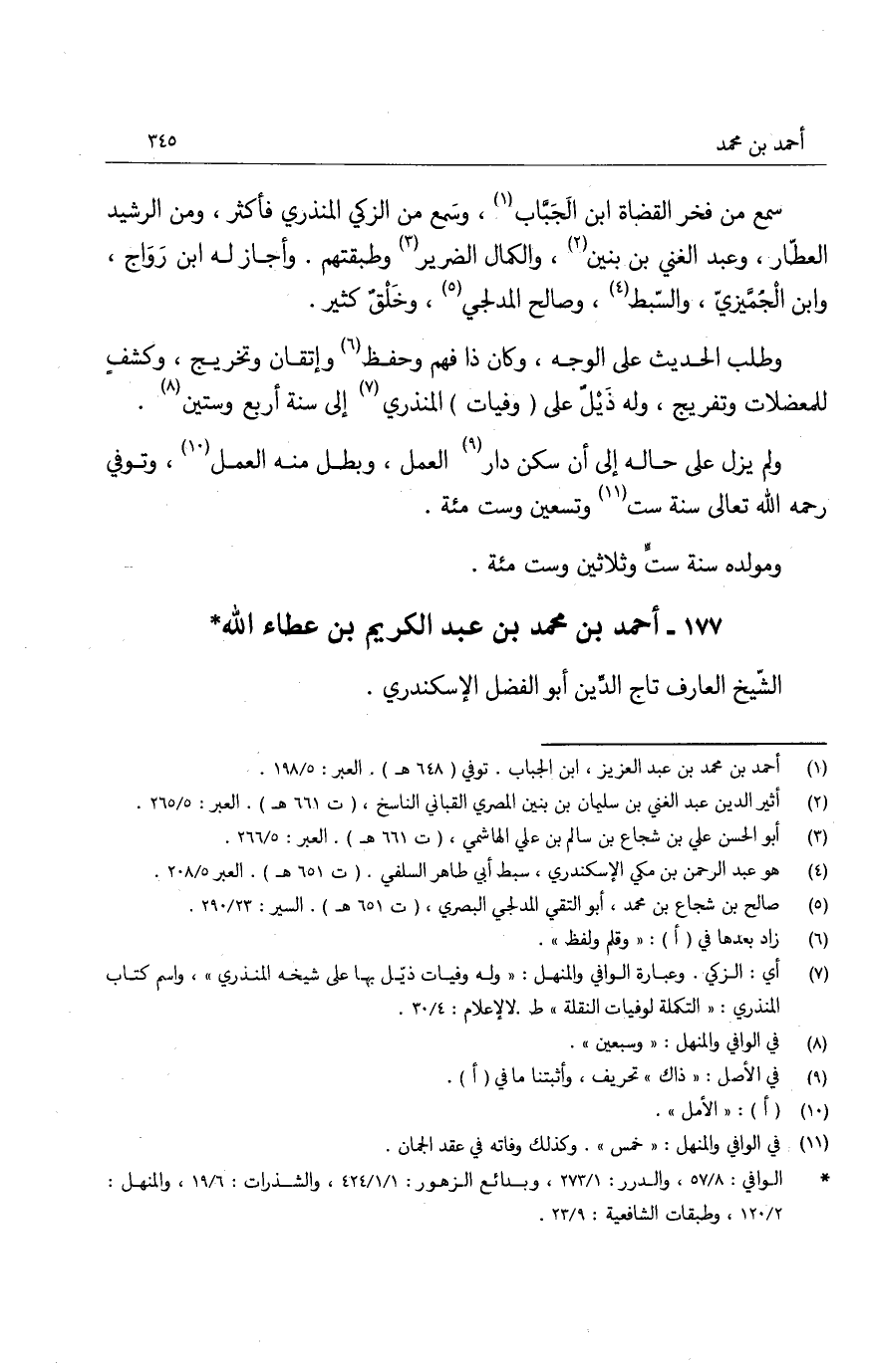 وطلب الحديث على الوجه، وكان ذا فهم وحفظ وإتقان وتخريج وكشفٍ للمعضلات وتفريج، وله ذَيْلٌ على وفيات المنذري إلى سنة أربع وستين.