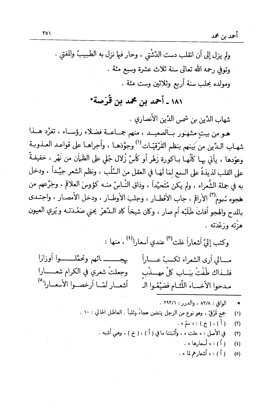 هو من بيت مشهور بالصعيد، منهم جماعة فضلاء رؤساء، تفرّد هذا شهاب الدين من بينهم بنظم القَرْقيّات وجوّدها، وأجراها على قواعد العذوبة وعوُدها، يأتي بها باكورة زَهْر أو كأسُ زُلال جُلي على الظمآن من نَهْر، خفيفةٌ على القلب لذيذة على السمع لِما لها في العقل من السَّلب، ونظم الشعر جيّداً، ودخل به في جملة الشعراء، ولم يكن متحيِّداً، وذاق منه كؤوس العلاقم، وجَرّعهم من هَجوه سُموم الأراقم، جاب الأقطار، وجلب الأوطار، ودخل الأمصار، واجتدى بالمدح والهجو أفات طَلبه أم صار، وكان شيخاً كاد الدهر يحني صَعْدَته ويُري العيون هزَته ورَعْدَته.