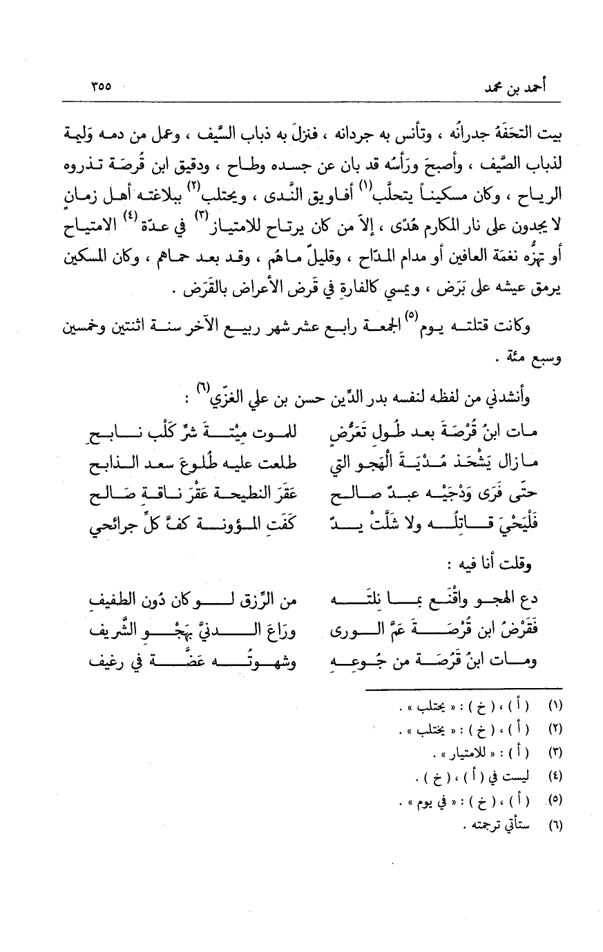 بيت التحفَه جدرانه، وتأنس به جردانه، فنزل به ذباب السيف، وعمل من دمه وليمة لذباب الصيف، وأصبح ورأسه قد بان عن جسده وطاح، ودقيق ابن قُرصة تذروه الرياح، وكان مسكيناً يتحلّب أفاويق الندى، ويحتلب ببلاغته أهل زمانٍ لا يجدون على نار المكارم هدىً، إلا من يرتاح للامتياز في عدة الامتياح أو تهزّه نغمة العافين أو مدام المدّاح، وقليلٌ ما هم، وقد بعد حماهم، وكان المسكين يرمق عيشه على بَرَص، ويمسي كالفأرة في قَرض الأعراض بالقَرَض.