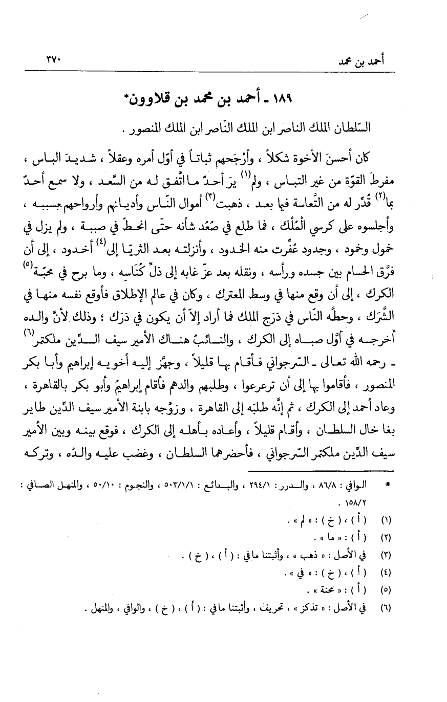 كان أحسن الأخوة شكلاً، وأرجحهم ثباتاً في أول أمره وعقلاً، شديد البأس، مفرط القوة من غير التباس، ولم ير أحدٌ ما اتفق له من السعد، ولا سمع أحدٌ بما قُدّر له من التعاسة فيما بعد، ذهبت أموال الناس وأديانهم وأرواحهم بسببه، وأجلسوه على كرسي المُلك، فما طلع في صُعد شأنه حتى انحطّ في صببة، ولم يزل في خمول وخمود، وجدود عُفّرت منه الخدود، وأنزلته بعد الثريّا إلى أخدود، إلى أن فرّق الحسام بين جسده ورأسه، ونقله بعد عزّ غابه إلى ذلّ كُناسه، وما برح في محبّة الكرك، إلى أن وقع منها في وسط المعترك، وكان في عالم الإطلاق فأوقع نفسه منها في الشَّرَك، وحطّه الناس في دَرَج الملك فما أراد إلا أن يكون في دَرَك؛ وذلك لأنّ والده أخرجه في أوّل صباه إلى الكرك، والنائب هناك الأمير سيف الدين ملكتمر - رحمه الله تعالى - السرجواني فأقام بها قليلاً، وجهّز إليه أخويه إبراهيم وأبا بكر المنصور، فأقاموا بها إلى أن ترعرعوا، وطلبهم والدهم فأقام إبراهيم وأبو بكر بالقاهرة، وعاد أحمد إلى الكرك، ثم إنه طلبه إلى القاهرة، وزوّجه بابنة الأمير سيف الدين طاير بغا خال السلطان، وأقام قليلاً، وأعاده بأهله إلى الكرك، فوقع بينه وبين الأمير سيف الدين ملكتمر السرجواني، فأحضرهما السلطان، وغضب عليه والده، وتركه