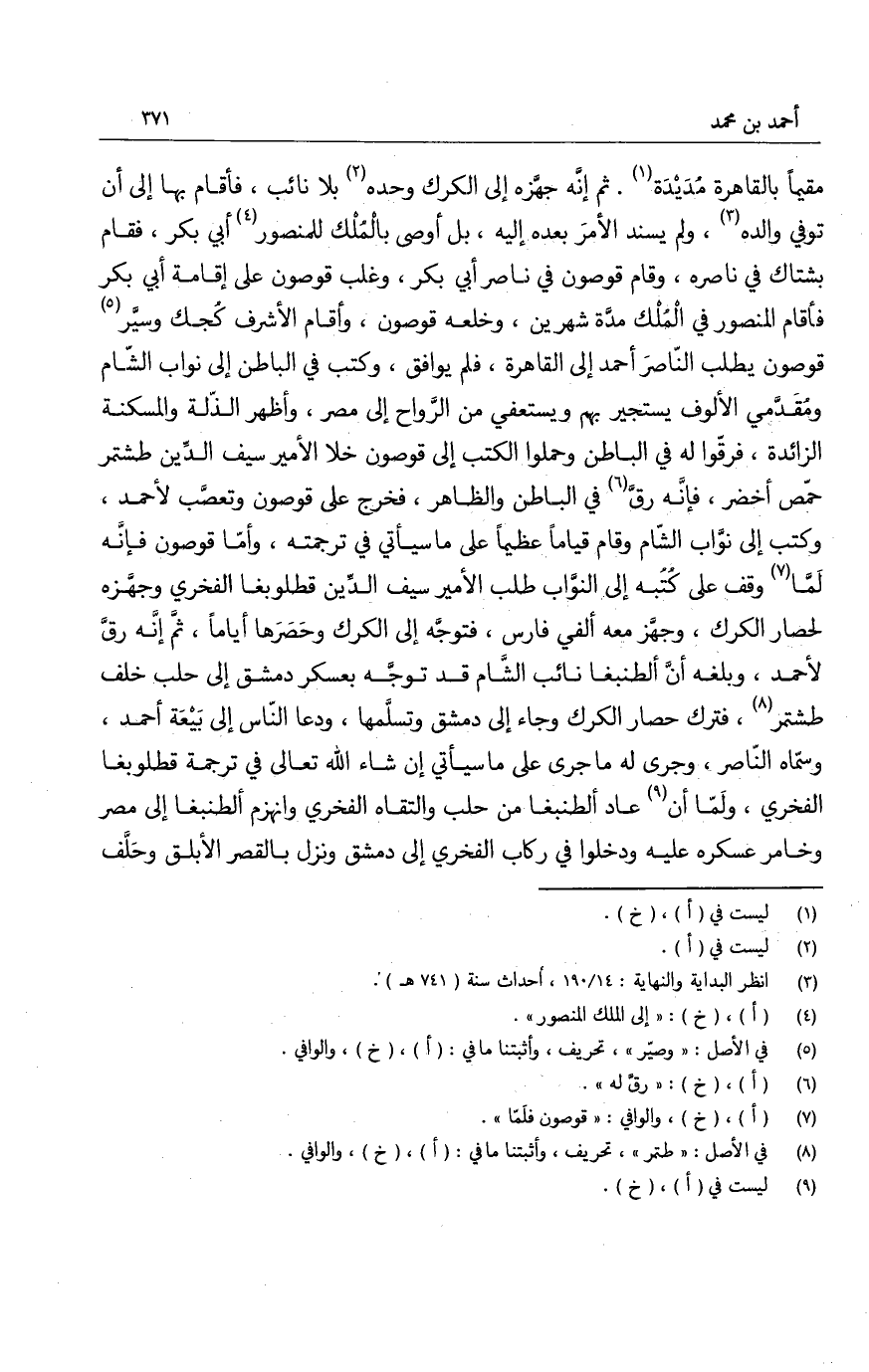 مقيماً بالقاهرة مُدَيدة. ثم إنه جهّزه إلى الكرك وحده بلا نائب، فأقام بها إلى أن توفي والده، ولم يسند الأمر بعده إليه، بل أوصى بالمُلك للمنصور أبي بكر، فقام بشتاك في ناصره، وقام قوصون في ناصر أبي بكر، وغلب قوصون على إقامة أبي بكر فأقام المنصور المُلك مدة شهرين، وخلعه قوصون، وأقام الأشرف كُجك وسيّر قوصون يطلب الناصر أحمد إلى القاهرة، فلم يوافق، وكتب في الباطن إلى نواب الشام ومقدّمي الألوف يستجير ويستعفي من الرواح إلى مصر، وأظهر الذلّة والمسكنة الزائدة، فرّقوا له في الباطن وحملوا الكتب إلى قوصون خلا الأمير سيف الدين طشتمر حمّص أخضر، فإنه رقّ في الباطن والظاهر، فخرج على قوصون وتعصّب لأحمد، وكتب إلى نوّاب الشام وقام قياماً عظيماً علة ما سيأتي في ترجمته، وأمّا قوصون فإنه لما وقف على كُتُبه إلى النوّاب طلب الأمير سيف الدين قطلوبغا الفخري وجهّزه لحصار الكرك، وجهّز معه ألفي فارس، فتوجّه إلى الكرك وحصرها أياماً، ثم إنه رقّ لأحمد، وبلغه أن ألطنبغا نائب الشام قد توجّه بعسكر دمشق إلى حلب خلف طشتمر، فترك حصار الكرك وجاء إلى دمشق وتسلّمها، ودعا الناس إلى بَيعة أحمد، وسمّاه الناصر، وجرى له ما جرى على ما سيأتي إن شاء الله تعالى في ترجمة قطلوبغا الفخري، ولما عاد ألطنبغا من حلب والتقاه الفخري وانهزم ألطنبغا إلى مصر وخامر عسكره عليه ودخلوا في ركاب الفخري إلى دمشق ونزل بالقصر الأبلق وحلّف