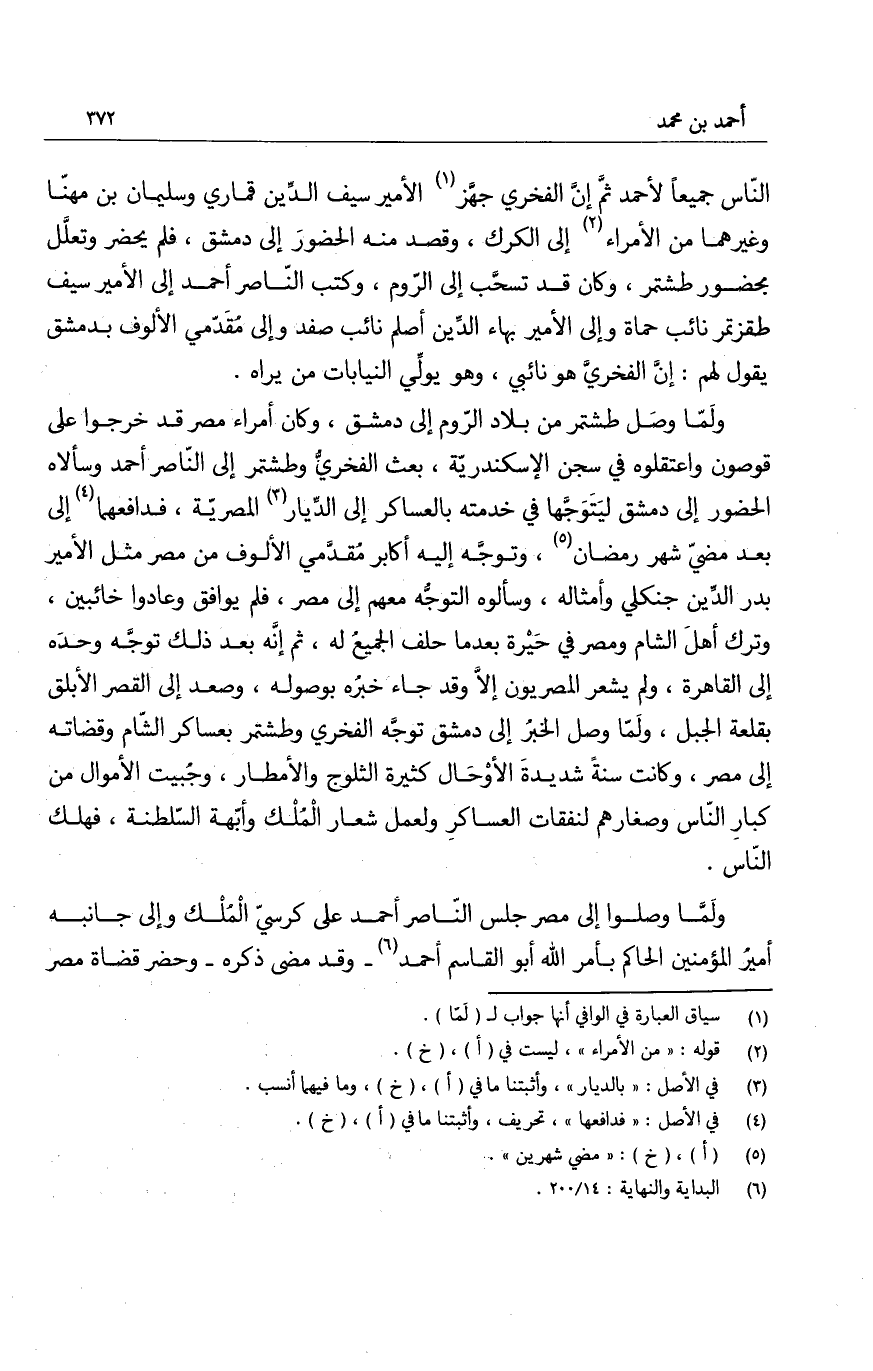 ولما وصلوا إلى مصر جلس الناصر أحمد على كرسيّ المُلك وإلى جانبه أمير المؤمنين الحاكم بأمر الله أبو القاسم أحمد - وقد مضى ذكره - وحضر قضاة مصر