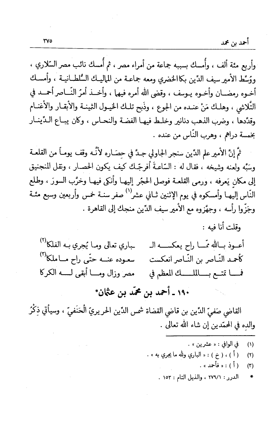 وأربع مئة ألف، وأمسك بسببه جماعة من أمراء مصر، ثم أمسك نائب مصر السلاري، ووُسِّط الأمير سيف الدين بكا الخضري ومعه جماعة من المماليك السّلطانية، وأمسك أخوه رمضان وأخوه يوسف، وقضى الله أمره فيهما، وأخذ أمرُ الناصر أحمد في التلاشي، وهلك مَنْ عنده من الجوع، وذبح تلك الخيول الثمينة والأبقار والأغنام وقدّدها، وضرب الذهب دنانير وخلط فيها الفضة والنحاس، وكان يباع الدينار بخمسة دراهم، وهرب الناس من عنده.