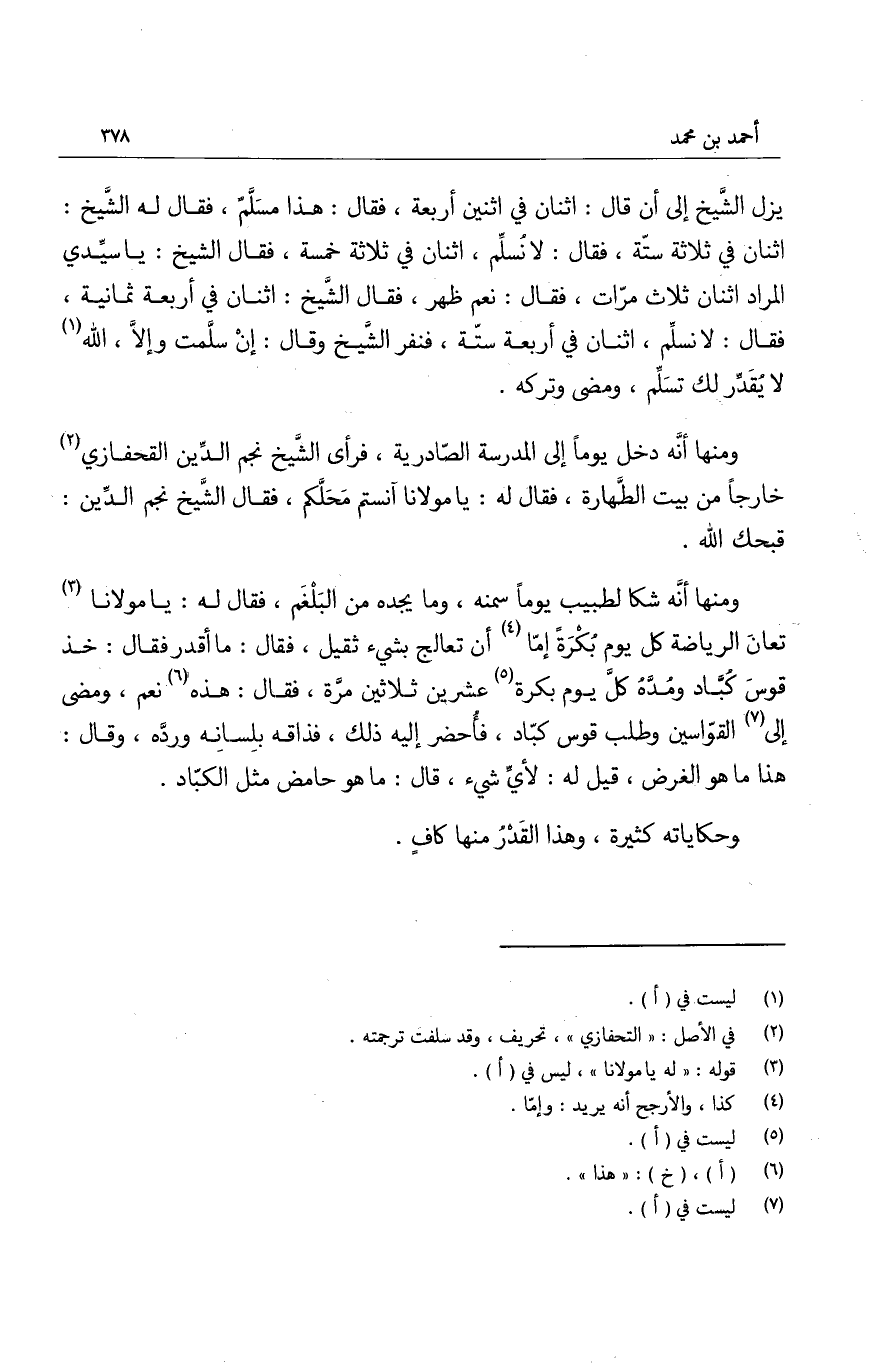 ومنها أنه شكا لطبيب يوماً سمنه، وما يجده من البلغم، فقال له: يا مولانا تعانَ الرياضة كل يوم بُكرةً إما أن تعالج بشيء ثقيل، فقال: ما أقدر فقال: خذ قوس كُبّاد ومُدّه كل يوم بكرة عشرين ثلاثين مرّة، فقال: هذه نعم، ومضى إلى القوّاسين وطلب قوس كبّاد، فأحضر إليه ذلك، فذاقه بلسانه وردّه، وقال: هذا ما هو الغرض، قيل له: لأي شيء، قال: ما هو حامض مثل الكبّاد.