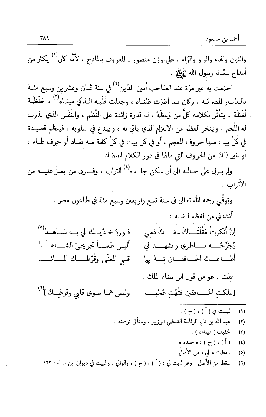 اجتمعت به غير مرة عند الصاحب أمين الدين في سنة ثمان وعشرين وسبع مئة بالديار المصرية، وكان قد أضرّت عيناه، وجعلت قلبه الذكي ميناه، حفَظة لُفَظة، يتأثّر بكلامه كلّ من وعظَه، له قدرة زائدة على النظم، والنفَس الذي يذوب له اللحم، وينخر العظم من الالتزام الذي يأتي به، ويبدع في أسلوبه، فينظم قصيدة في كل بيت منها حروف المعجم، أو في كل بيت في كل كلمة منه ضاد أو حرف ظاء، أو غير ذلك من الحروف التي ما لها في دور الكلام اعتضاد.