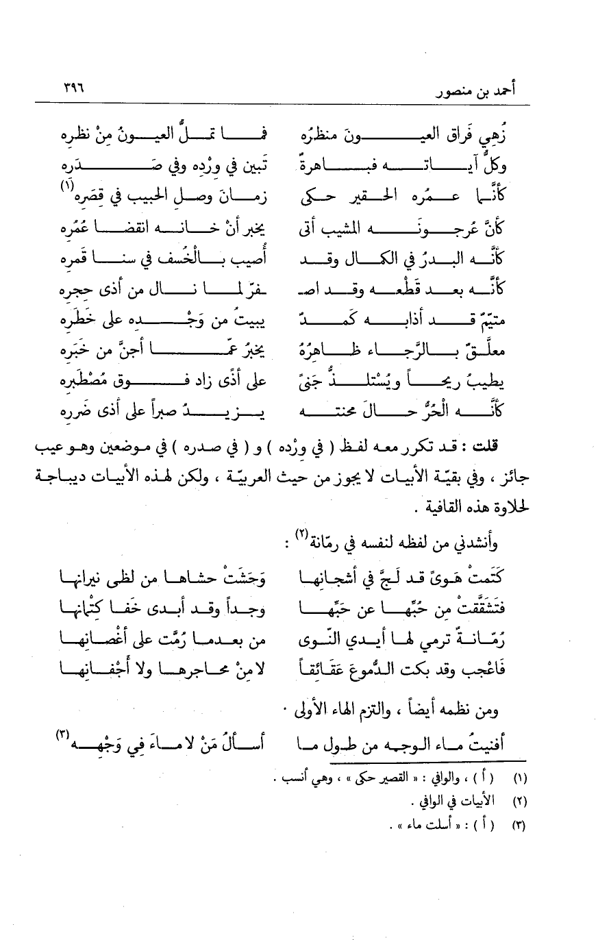 قلت: قد تكرر معه لفظ في وِرده وفي صدره في موضعين وهو عيب جائز، وفي بقية الأبيات لا يجوز من حيث العربية، ولكن لهذه الأبيات ديباجة لحلاوة هذه القافية.