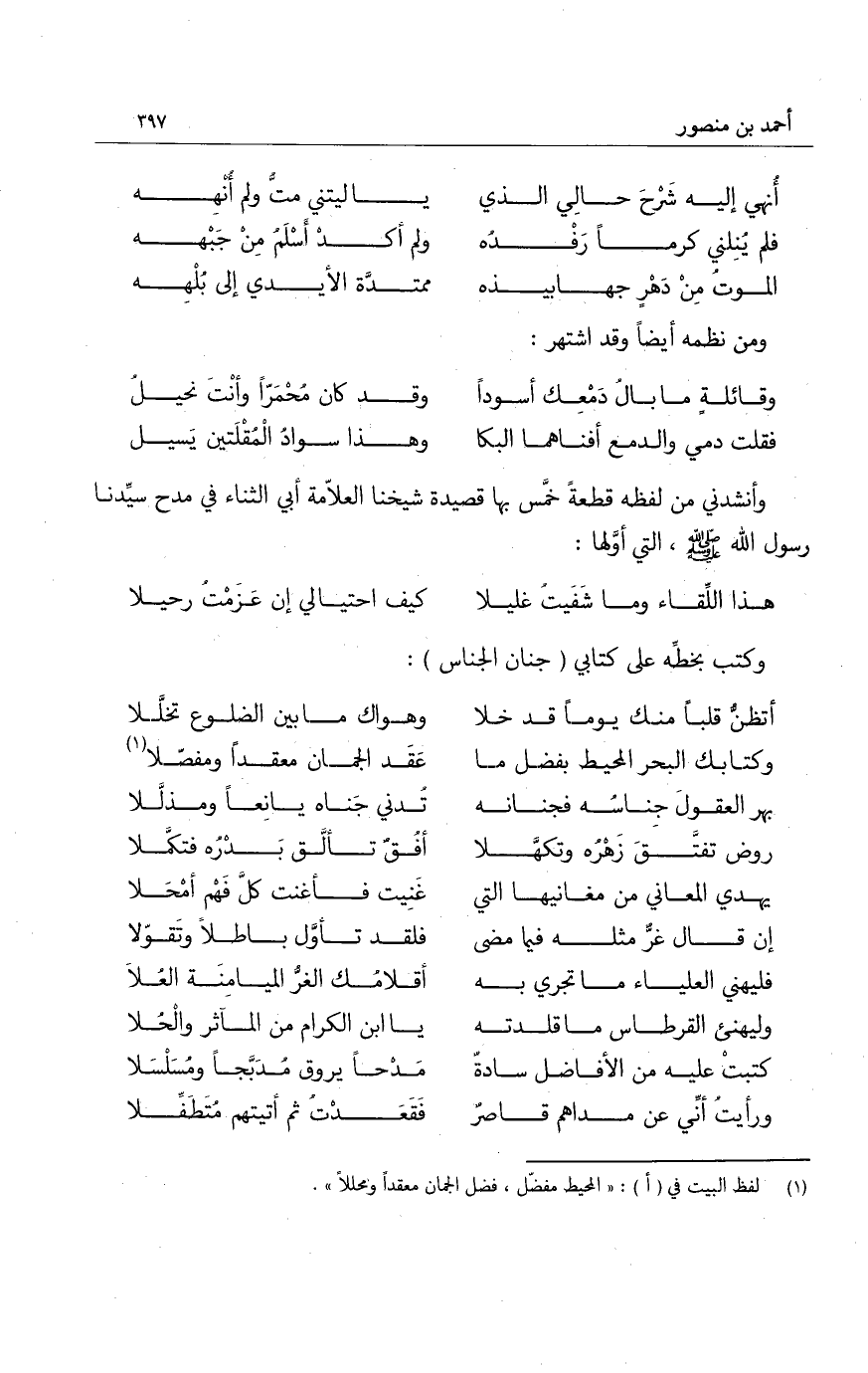 وأنشدني من لفظه قطعةً خمَّس بها قصيدة شيخنا العلاّمة أبي الثناء في مدح سيّدنا رسول الله صَلَّى اللهُ عَلَيْهِ وَسَلَّمَ، التي أولها: