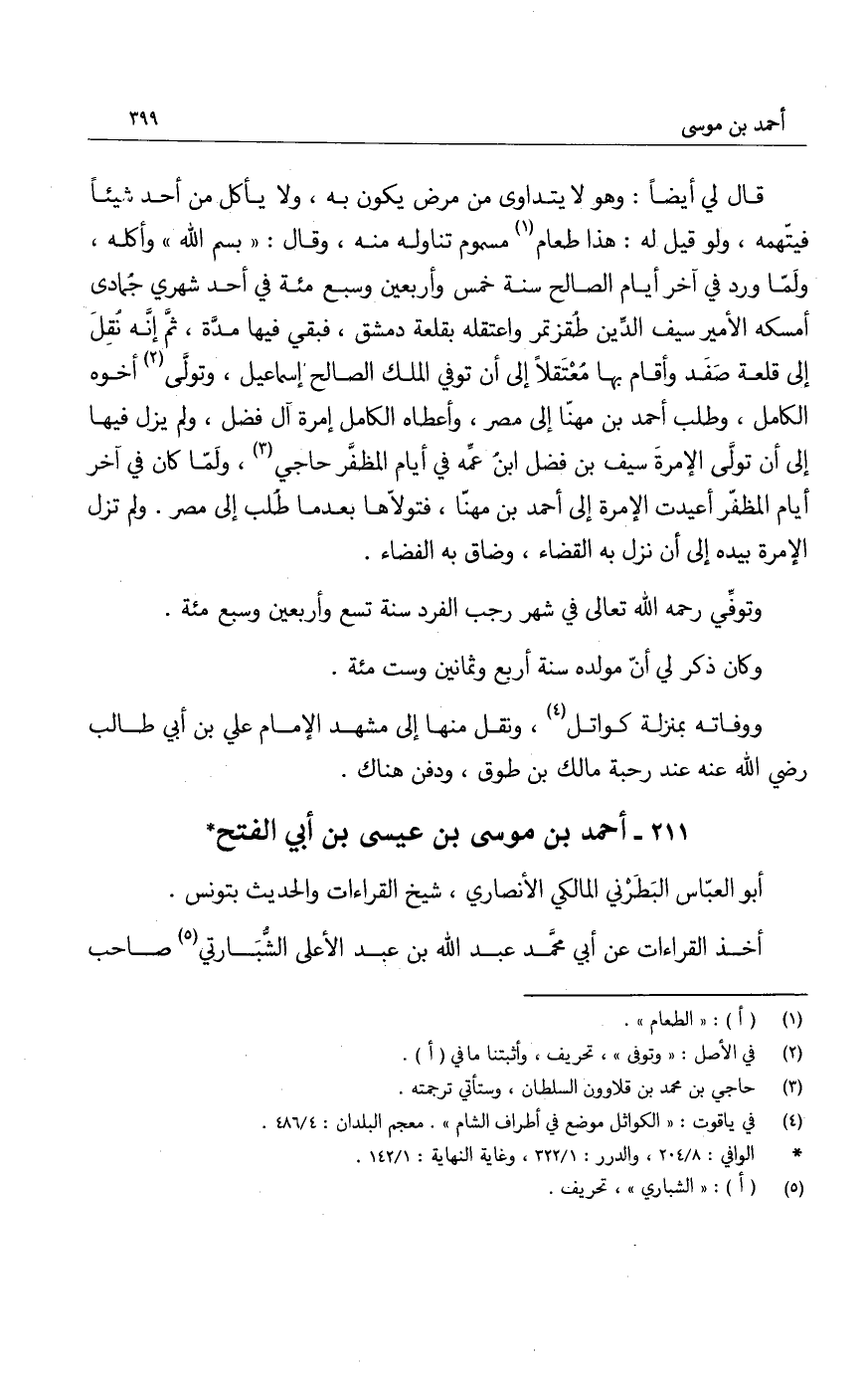 قال لي أيضاً: وهو لا يتداوى من مرض يكون به، ولا يأكل من أحد شيئاً فيتّهمه، ولو قيل له: هذا طعام مسموم تناوله منه، وقال: " بسم الله " وأكله، ولمّا ورد في آخر أيام الصالح سنة خمس وأربعين وسبع مئة في أحد شهري جُمادى أمسكه الأمير سيف الدين طُقزتمر واعتقله بقلعة دمشق، فبقي فيها مدّة، ثم إنه نُقل إلى قلعة صَفد وأقام بها مُعتقلاً إلى أن توفي الملك الصالح إسماعيل، وتولّى أخوه الكامل، وطلب أحمد بن مهنّا إلى مصر، وأعطاه الكامل إمرة آل فضل، ولم يزل فيها إلى أن تولّى الإمرة سيف بن فضل ابن عمّه في أيام المظفّر حاجي، ولما كان في آخر أيام المظفّر أعيدت الإمرة إلى أحمد بن مهنّا، فتولاّها بعدما طُلب إلى مصر، ولم تزل الإمرة بيده إلى أن نزل به القضاء، وضاق به الفضاء.