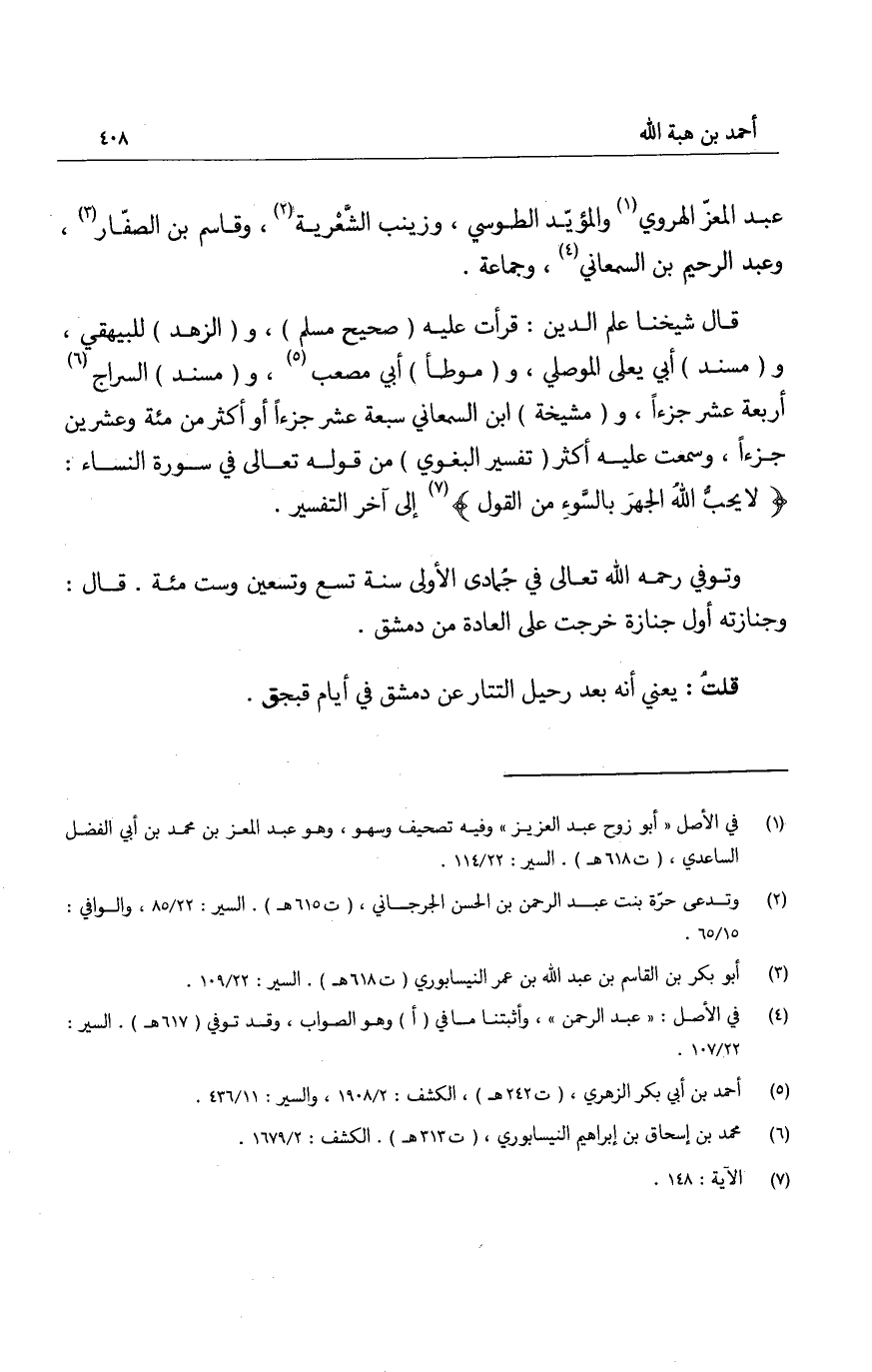 قال شيخنا علم الدين: قرأت عليه صحيح مسلم، والزهد للبيهقي، ومسند أبي يعلى الموصلي، وموطأ أبي مصعب، ومسند السراج أربعة عشر جزءاً، ومشيخة ابن السمعاني سبعة عشر جزءاً أو أكثر من مئة وعشرين جزءاً، وسمعت عليه أكثر تفسير البغوي من قوله تعالى في سورة النساء: " لا يحبّ الله الجهر بالسوء من القول " إلى آخر التفسير.