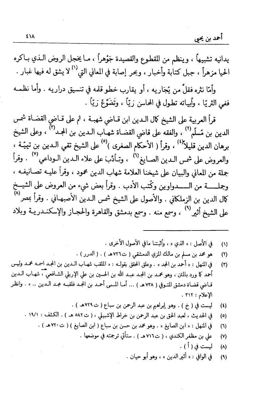 يدانيه تشبيهاً، وينظم من المقطوع والقصيدة جَوْهراً، ما يخجل الروض الذي باكره الحيا مزهراً، جبل كتابة وأخبار، وبحر إصابة في المعاني التي لا يشق له فيها غبار.
