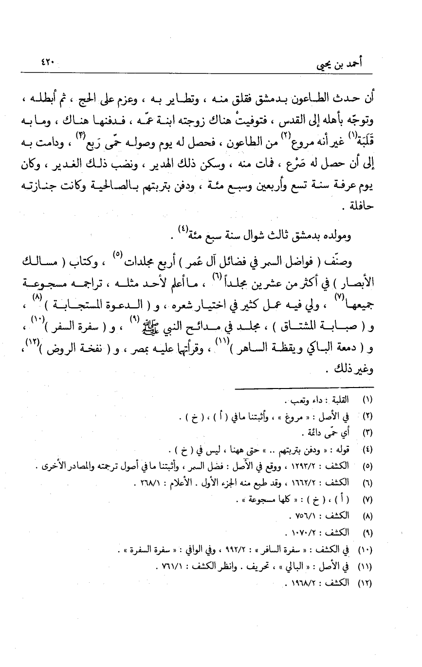 أن حدث الطاعون بدمشق فقله منه، وتطاير به، وعزم على الحج، ثم أبطله، وتوجّه بأهله إلى القدس، فتوفيت هناك زوجته ابنه عمه، فدفنها هناك، وما به قلَبَة غير أنه مروع من الطاعون، فحصل له يوم وصوله حتى ربع، ودامت به إلى أن حصل له صَرْع، فمات منه، وسكن ذلك الهدير، ونضب ذلك الغدير، وكان يوم عرفة سنة تسع وأربعين وسبع مئة، ودفن بتربتهم بالصالحية وكانت جنازته حافلة.