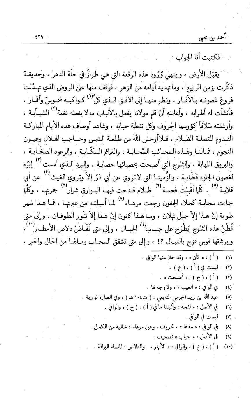 فكتب أنا الجواب: يقبّل الأرض، وينهي وُرُود هذه الرقعة التي هي طرازٌ في حلّة الدهر، وحديقة ذكّرت بزمن الربيع، وما تهديه أيامه من الزهر، فوقف منها على الروض الذي تهدّلت فروعُ غصونه بالأثمار، ونظر منها إلى الأفق الذي كلّ كواكبه شموسٌ وأقمار، فأنشأت له أطرابه، وأعلمته أن قلم مولانا يفعل بالألباب ما لا يفعله نغمة الشبآبة، وأرشفته سُلافاً كؤوسها الحروف وكل نقطة حبابَه، وشاهد أوصاف هذه الأيام المباركة القدوم المتصلة الظلام، فلا أوحش الله من طلعة الشمس وحاجب الهلال وعيون النجوم، فما لنا ولهذه السحائب السحابة، والغمائم السكّابة، والرعود الصخّابة، والبروق اللهابة، والثلوج التي أصبحت بحصبائها حصابة، والبرد الذي أمست إبَرُه لغصون الجلود قَطّابة، والزُّميتا التي لا تروي عن أبي ذرّ إلاّ وتروي الغيث عن أبي قلابة، كلّما أقبلت فحمة ظلام قدحت فيها البوارق شرار جمرتها، وكلّما جاءت سحابة كحلاء الجفون رجعت مرهاء لما أسبلته من عبرتها، فما هذا شهر طوبة إنْ هذا إلا جبل ثهلان، وما هذا كانون إنْ هذا إلا تنّور الطوفان، وإلى متى قُطْنُ هذه الثلوج يُطرَح على جباب الجبال، وإلى متى نُقاضُ دلاص الأمطار، ويرشقها قوس قزح بالنبال؟!، وإلى متى تشقق السحاب وما لها من الحلل والحبر،