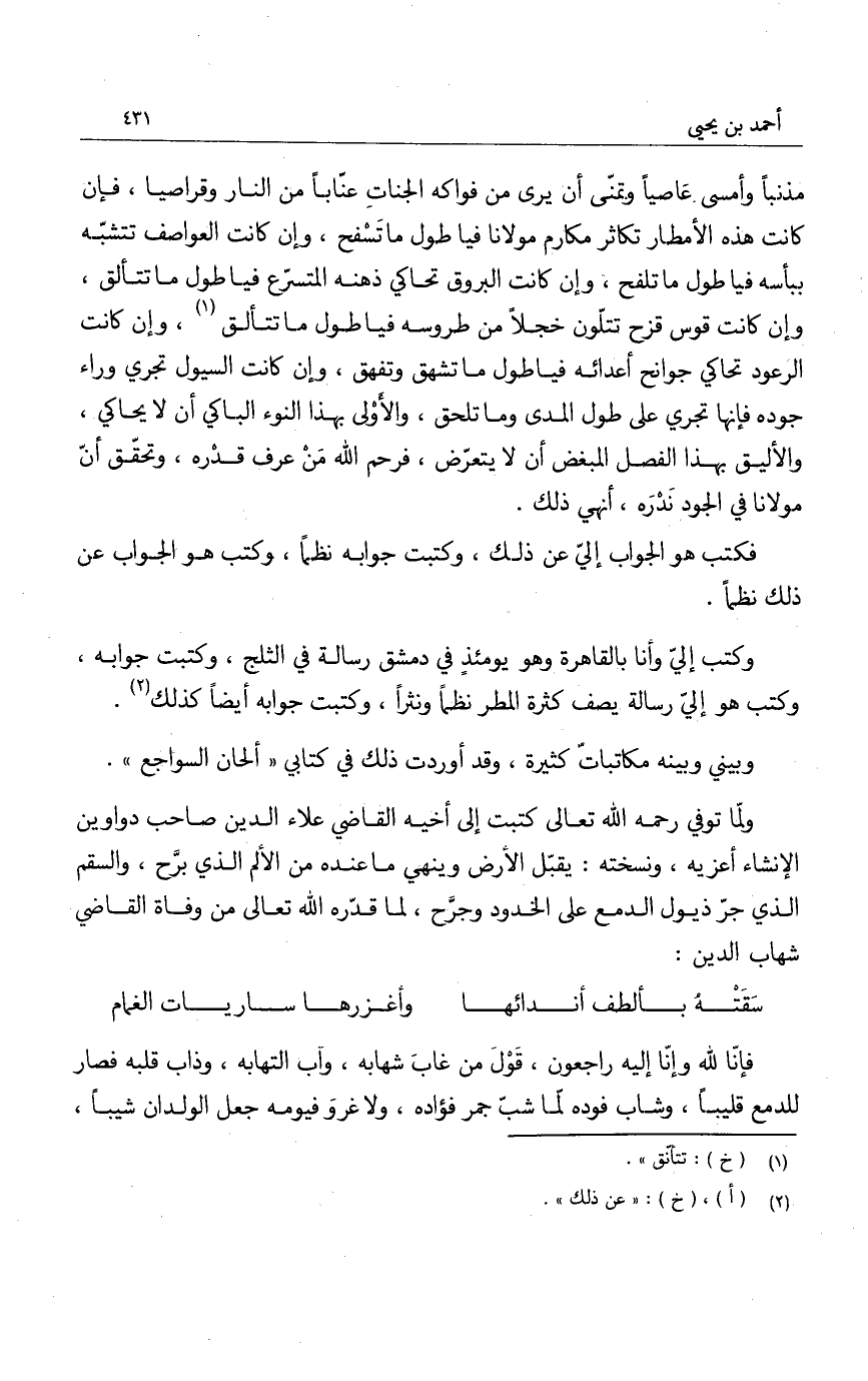 وكتب إليّ وأنا بالقاهرة وهو يومئذٍ في دمشق رسالة في الثلج، وكتبت جوابه، وكتب هو إليّ رسالة يصف كثرة المطر نظماً ونثراً، وكتبت جوابه أيضاً كذلك.