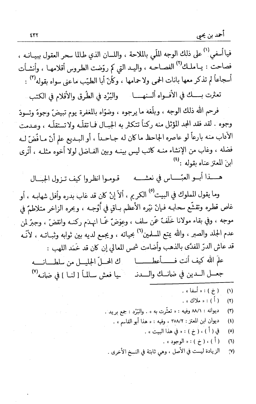 فيا أسفي على ذلك الوجه الملّي بالملاحة، واللسان الذي طالما سحر العقول ببيانه، فصاحت: يا ملك الفصاحة، واليد كم روّضت الطروس أقلامها، وأنشأت أسجاعاً لم تذكر معها بانات الحمى ولا حمامها، وكأنّ أبا الطيّب ما عنى سواه بقوله: