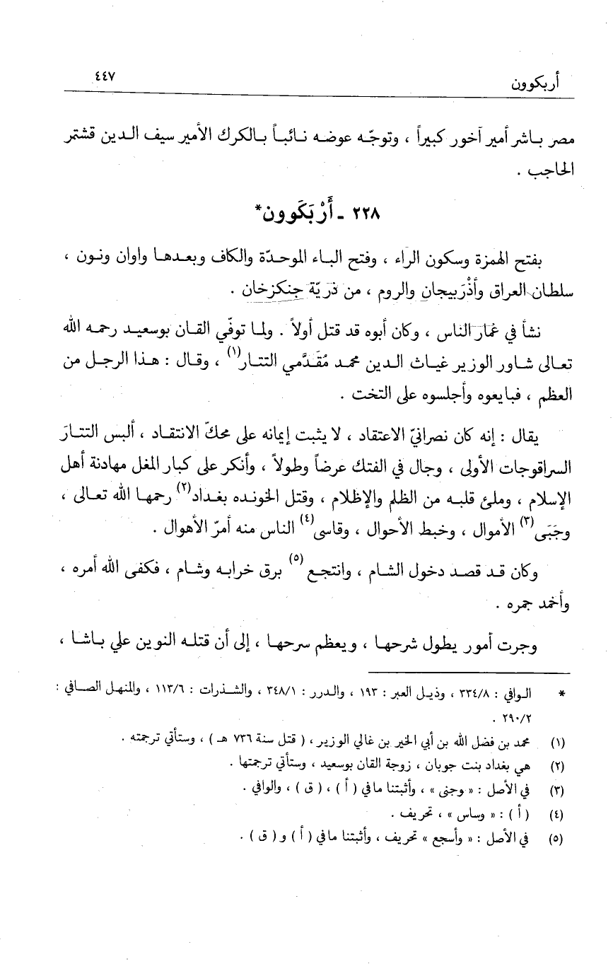 يقال: إنه كان نصرانيّ الاعتقاد، لا يثبت إيمانه على محكّ الانتقاد، ألبس التتار السراقوجات الأولى، وجال في الفتك عرضاً وطولاً، وأنكر على كبار المغل مهادنة أهل الإسلام، ومليء قلبه من الظلم والإظلام، وقتل الخوندة بغداد رحمها الله تعالى، وجَبى الموال، وخبط الأحوال، وقاسى الناس منه أمرّ الأهوال.