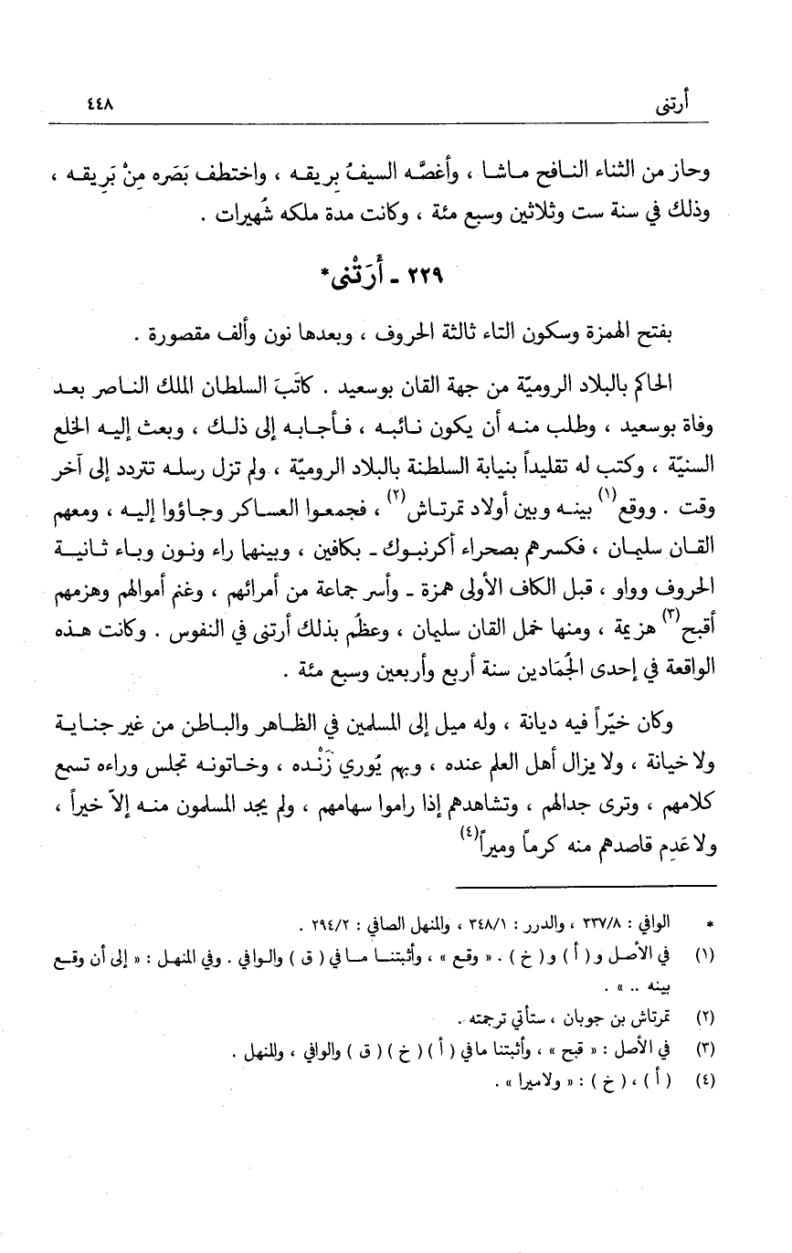 الحاكم بالبلاد الرومية من جهة القان بوسعيد، كاتَبَ السلطان الملك الناصر بعد وفاة بوسعيد، وطلب منه أن يكون نائبه، فأجابه إلى ذلك، وبعث إليه الخلع السنيّة، وكتب له تقليداً بنيابة السلطنة بالبلاد الرومية، ولم تزل رسله تتردد إلى آخر وقت، ووقع بينه وبين أولاد تمرتاش، فجمعوا العساكر وجاؤوا إليه، ومعهم القان سليمان، فكسرهم بصحراء أكرنبوك - بكافين، وبينهما راء ونون وباء ثانية الحروف وواو، قبل الكاف الأولى همزة - وأسر جماعة من أمرائهم، وغنم أموالهم وهزمهم أقبح هزيمة، ومنها خمل القان سليمان، وعظُم بذلك أرتنى في النفوس. وكانت هذه الواقعة في إحدى الجُمَادين سنة أربع وأربعين وسبع مئة.