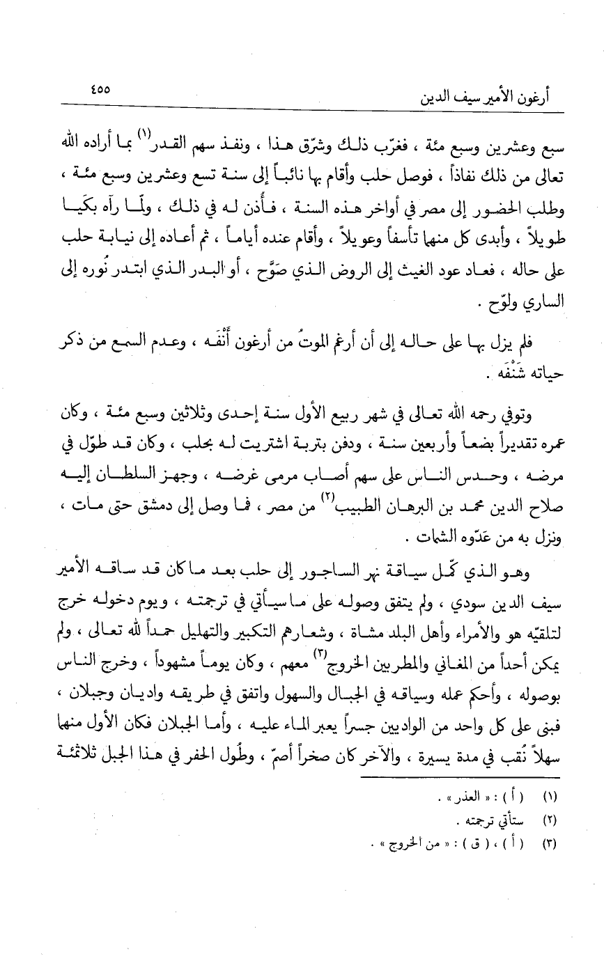 وهو الذي كمل سياقة نهر الساجور إلى حلب بعد ما كان في ساقه الأمير سيف الدين سودي، ولم يتفق وصوله على ما سيأتي في ترجمته، ويوم دخوله خرج لتلقيه هو والأمراء وأهل البلد مشاة، وشعارهم التكبير والتهليل حمداً لله تعالى، ولم يمكن أحداً من المغاني والمطربين الخروج معهم، وكان يوماً مشهوداً، وخرج الناس بوصوله، وأحكم عمله وسياقه في الجبال والسهول واتفق في طريقه واديان وجبلان، فبنى على كل واحد من الواديين جسراً يعبر الماء عليه، وأما الجبلان فكان الأول منهما سهلاً نقب في مدة يسيرة، والآخر كان صخراً أصم، وطول الحفر في هذا الجبل ثلاث مئة