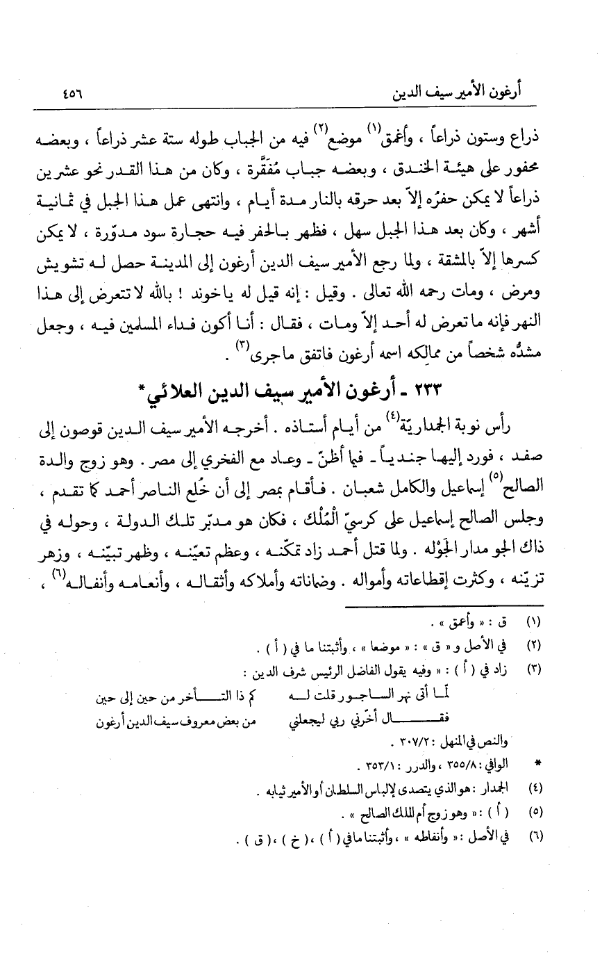 ذراع وستون ذراعاً، وأغمق موضع فيه من الجباب طوله ستة عشر ذراعاً، وبعضه محفور على هيئة الخندق، وبعضه جباب مفقرة، وكان من هذا القدر نحو عشرين ذراعاً لا يمكن حفره إلا بعد حرقه بالنار مدة أيام، وانتهى عمل هذا الجبل في ثمانية أشهر، وكان بعد هذا الجبل سهل، فظهر بالحفر فيه حجارة سود مدوّرة، لا يمكن كسرها إلى بالمشقة، ولما رجع الأمير سيف الدين أرغون إلى المدينة حصل له تشويش ومرض، ومات رحمه الله تعالى. وقيل: إنه قيل له يا خوند! بالله لا تتعرض إلى هذا النهر فإنه ما تعرض له أحد إلا ومات، فقال: أنا أكون فداء المسلمين فيه، وجعل مشده شخصاً من ممالكه اسمه أرغون فاتفق ما جرى.