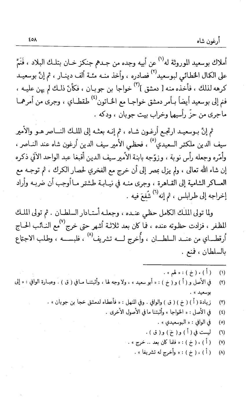 ثم إن بوسعيد ارتجع أرغون شاه، ثم إنه بعثه إلى الملك الناصر هو والأمير سيف الدين ملكتمر السعيدي، فحظي الأمير سيف الدين أرغون شاه عند الناصر، وأمره وجعله رأس نوبة، وزوجه بابنة الأمير سيف الدين أقبغا عبد الواحد الآتي ذكره إن شاء الله تعالى، ولم يزل بمصر إلى أن خرج مع الفخري لحصار الكرك، ثم توجه مع العساكر الشامية إلى القاهرة، وجرى منه في نيابة طشتمر ما أوجب أن ضربه وأراد إخراجه إلى طرابلس، ثم إنه شفع فيه.