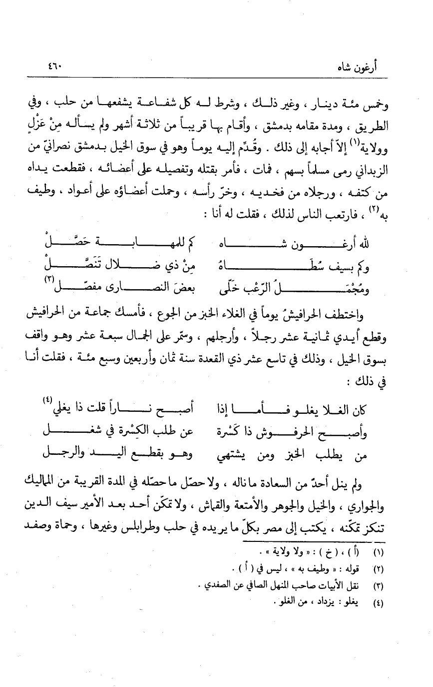 واختطف الحرافيشُ يوماً في الغلاء الخبز من الجوع، فأمسك جماعة من الحرافيش وقطع أيدي ثمانية عشر رجلاً، وأرجلهم، وسمر على الجمال سبعة عشر وهو واقف بسوق الخيل، وذلك في تاسع عشر ذي القعدة سنة ثمان وأربعين وسبع مئة، فقلت أنا في ذلك: