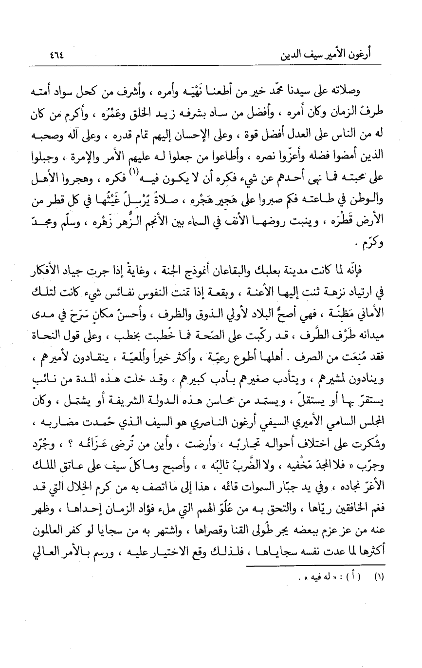 فإنه لما كانت مدينة بعلبك والبقاعان أنموذج الجنة، وغاية إذا جرت جياد الأفكار في ارتياد نزهة ثنت إليه الأعنة، وبقعة إذا تمنت النفوس نفائس شيء كانت لتلك الأماني مظنة، فهي أصح البلاد لأولي الذوق والظرف، وأحسنُ مكان سرح في مدى ميدانه طرف الطرف، قد ركبت على الصحة فما خطبت بخطب، وعلى قول النحاة فقد منعت من الصرف. أهلها أطع رعية، وأكثر خيراً وألمعية، ينقادون لأميرهم، وينادون لمشيرهم، ويتأدب صغيرهم بأدب كبيرهم، وقد خلت هذه المدة من نائبٍ يستقر بها أو يستقل، ويستمد من محاسن هذه الدولة الشريفة أو يشتمل، وكان المجلس السامي الأميري السيفي أرغون الناصري هو السيف الذي حُمدت مضاربه، وشكرت على اختلاف أحواله تجاربه، وأرضت، وأين من ترضى عزائمه؟، وجرد وجرب فلا المجدُ مخفيه، ولا الربُ ثالبه، واصبح وما كل سيف على عاتق الملك الأغر نجاده، وفي يد جبار السموات قائمه، هذا إلى ما اتصف به من كرم الخلال التي قد فغم الخافقين رياها، والتحق به من علو الهمم التي ملء فؤاد الزمان إحداها، وظهر عنه من عز عزم ببعضه يجر طولى القنا وقصراها، واشتهر به من سجايا لو كفر العالمون أكثرها لما عدت نفسه سجاياها، فلذلك وقع الاختيار عليه، ورسم بالأمر العالي