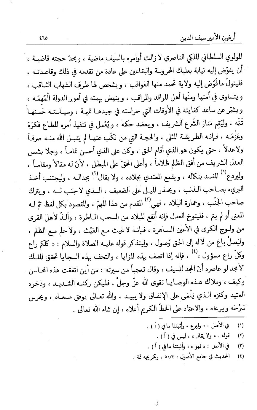 المولوي السلطاني الملكي الناصري لا زالت أوامره بالسيف ماضية، ويجد حجته قاضية، أن يفوض إليه نيابة بعلبك المحروسة والبقاعين على عادة من تقدمه في ذلك وقاعدته، فليتول ما فوض غليه ولاية تحمد منها العواقب، ويشخص لها طرف الشهاب الثاقب، ويتساوى في أمنها منها أهل المراقد والمراقب، وينهض بهمته في أمور الدولة المهمه، ويشمر عن ساعد كفايته في الأوقات التي حراسته في جيدها تميمة، وسياسته لحسنها تتمة، وليقم منار الشرع الشريف، ويعضد حكمه، ويعمل في تنفيذ أمره المطاع فكرهُ وعزمه، فإنه الطريقة المثلى، والحجة التي من نكب عنها لم يقبل الله منه صرفاً ولا عدلاً، حتى يكون هو الذي أقام الحق، وكان على الذي أحسن تماماً، وجلا بشمس العدل الشريف من أفق الظلم ظلاماً، وأعلى المحق على المبطل، لأنّ له مقالاً ومقاماً، وليردع المفسد بنكاله، ويقمع المعتدي بجلاده، ولا يقال بجداله، وليجتنب أخذ البريء بصاحب الذنب، ويحذر الميل على الضيعف، الذي لا جنب له، ويترك صاحب الجنب، وعمارة البلاد، فهي المقدم من هذا المهمّ، والمقصود بكل لفظ تم له المعنى أو لم يتم، فليتوخ العدل فإنه أنفع للبلاد من السحب الماطرة، والذ لأهل القرى من ولوج الكرى في الأعين الساهرة، فإنه لا غيث مع العيث، ولا حلم مع الظلم، وليصل باعَ من لا له إلى الحق وصول، وليتذكر قوله عليه السالم والسلام: " كلكم راع وكل راع مسؤول "، فإنه إذا اتصف بهذه المزايا، والتحف بهذه السجايا تحقق الملك الأمجد لو عاصره أنّ المجد للسيف، وقال تعجباً من سيرته: من أين اتفقت هذه المحاسن وكيف، وملاك هذه الوصايا تقوى الله عز وجل، فليكن ركنه الشديد، وذخره العتيد وكنزه الذي ينمى على الإنفاق ولا يبيد، والله تعالى يوفق مسعاه، ويحرس سرحه ويرعاه والاعتماد على الخط الكريم أعلاه، إن شاء الله تعالى.