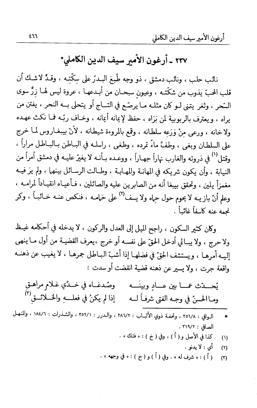 نائب حلب، ونائب دمشق، ذو وجه طبعَ البدرُ على سكته، وقد لا شك أن قلب المحبّ يذوب من شكته، وعيونٍ سبحان من أبدعها، عروة ليس لها زر سوى السحر، وثغر يتمنى لو كان مثله ما يرضع في التاج أو يتحلى به النحر، ويفتن من يراه، ويعترف بالبوبية لمن براه، وحفظ لإيمانه، وخاف ربه فما نكث عهده ولا خانه، ورعى من ورعه سلطانه، وقمع بالمروءة شيطانه، لأن بيبغاروس لما خرج على السلطان وبغى، وطف ماءُ تمرده، طغى، راسله في الباطن بالباطل مراراً، وقتل في ذروته والغارب نهاراً جهاراً، ووعده بأنه لا يغير عليه في دمشق أمراً من النيابة، وأن يكون شريكه في المهانة والمهابة، وطالت الرسائل بينهما، ولم ير فيه مغمزاً يلين، وتحقق بيبغا أنه من الصابرين عليه والصائلين، فأعياه انقياداً لمرامه، وعلم أنّ بازيه لا يحوم حول حماه ولا يسف على حمامه، فنكص عنه خائباً، وكر نجمه عنه كاسفاً غائباً.
