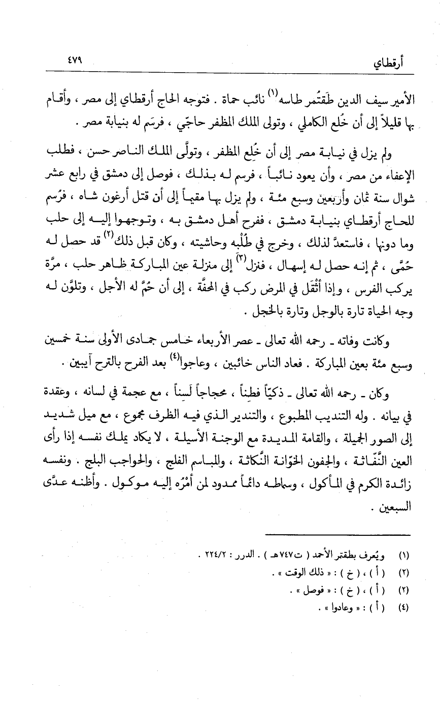 ولمن يزل في نيابة مصر إلى أن خلع المظفر، وتولى الملك الناصر حسن، فطلب الإعفاء من مصر، وأن يعود نائباً، فرسم له بذلك، فوصل إلى دمشق في رابع عشر شوال سنة ثمان وأربعين وسبع مئة، ولم يزل بها مقيماً إلى أن قتل أرغون شاه، فرسم للحاج أرقطاي بنيابة دمشق، ففرح أهل دمشق به، وتوجهوا إليه إلى حلب وما دونها، فاستعد لذلك، وخرج في طلبه وحاشيته، وكان قبل ذلك قد حصل له حمى، ثم إنه حصل له إسهال، فنزل إلى منزلة عين المباركة ظاهر حلب، مرة يركب الفرس، وإذا أثقل في المرض ركب في المحفة، إلى أن حم له الأجل، وتلون له وجه الحياة تارة بالوجل وتارة بالخجل.