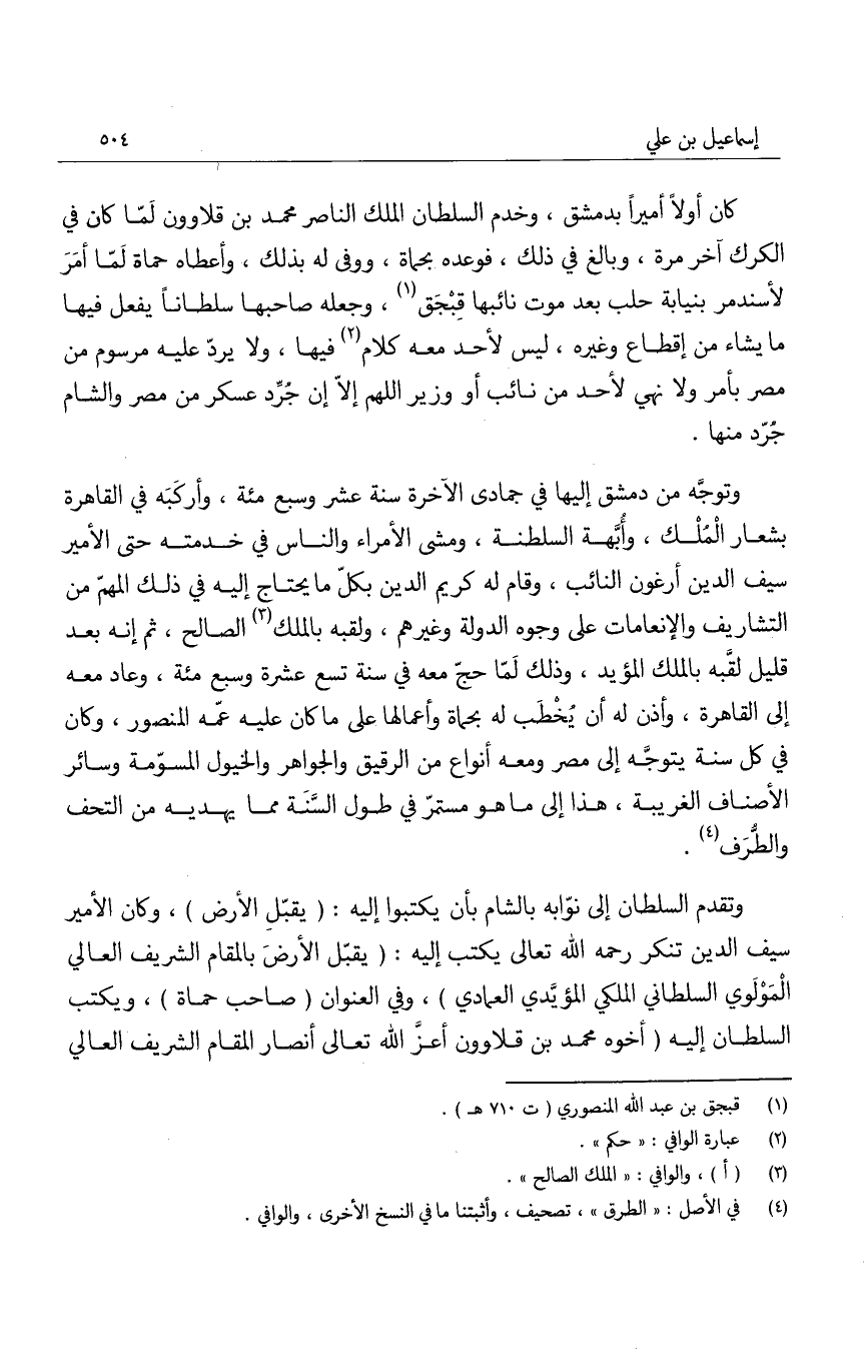 وتوجه من دمشق إليها في جمادى الآخرة سنة عشر وسبع مئة، وأركبه في القاهرة بشعار الملك، وأبهة السلطنة، ومشى الأمراء والناس في خدمته حتى الأمير سيف الدين أرغون النائب، وقام له كريم الدين بكلّ ما يحتاج إليه في ذلك المهمّ من التشاريف والإنعامات على وجوه الدولة وغيرهم، ولقبه بالملك الصالح، ثم إنه بعد قليل لقبه بالملك المؤيد، وذلك لما حج معه في سنة تسع عشرة وسبع مئة، وعاد معه إلى القاهرة، وأذن له أن يُخطب له بحماة وأعمالها على ما كان عليه عّمه المنصور، وكان في كل سنة يتوجه إلى مصر ومعه أنواع من الرقيق والجواهر والخيول المسوّمة وسائر الأصناف الغريبة، هذا إلى ما هو مستمر في طول السنة مما يهديه من التحف والطرف.