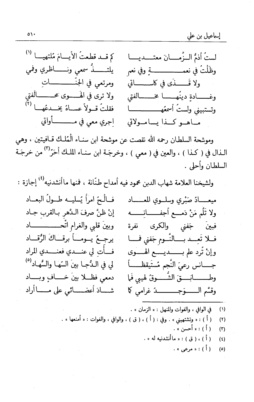 وموشحة السلطان رحمه الله نقصت عن الموشحة ابن سناء الملك قافيتين، وهي الذال في كذا، والعين في معي، وخرجة ابن سناء الملك أحر من خرجة السلطان وأحلى.