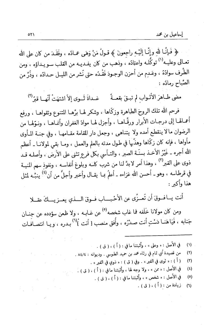 فرحم الله تلك الروحَ الطاهرة وكاها، وشكر لها برها المتنوع وتقواها، ورفع أعمالها إلى درجات الأبرار ورقاها، وأجزل لها موادَ الغفران وأنماها، ونوّلها من الرضوان ما لا ينقطع أمده ولا يتناهى، وجعل دار المقامة مقامها، وفي جنة المأوى مأواها، فإنه كان زكاها وهذبها في طول مدته بالعلم والعلم، وما بقي لمولانا - أعظم الله أجره - غير الأخذ بسنة الصبر، والتأسي بكل فرعٍ تثنى على الأرض، وأصله قد ذوى على القبر، وهذا أمر لا بد لنا من شرب كأسه وبلوغ أنفاسه، ونفوذ سهم المنية في قرطاسه، وهو - أحسن الله عزاءه - أعلمُ بما يقال وأخبر وأجل من أن ينبه لمثل هذا وأكبر: