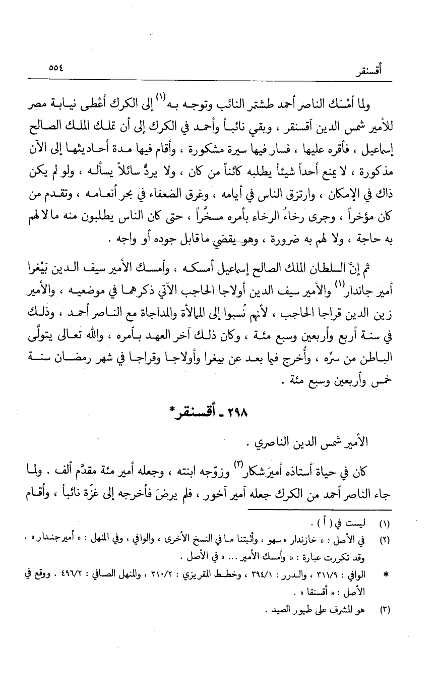 ولما أمسك الناصر أحمد طشتمر النائب وتوجه به إلى الكرك أعطى نيابة مصر للأمير شمس الدين أقسنقر، وبقي نائباً وأحمد في الكرك إلى أن تملك الملك الصالح إسماعيل، فأقره عليها، فسار فيها سيرة مشكورة، وأقام فيها مدة أحاديثها إلى الآن مذكورة، لا يمنع أحداً شيئاً يطالبه كائناً من كان، ولا يرد سائلاً يسأله، ولو لم يكن ذلك في الإمكان، وارتزق الناس في أيامه، وغرق الضعفاء في بحر أنعامه، وتقدم من كان مؤخراً، وجرى رخاءُ الرخاء بأمره مسخراً، حتى كان الناس يطلبون منه مالا لهم به حاجة، ولا لهم به ضرورة، وهو يقضي ما قابله جده أو واجه.