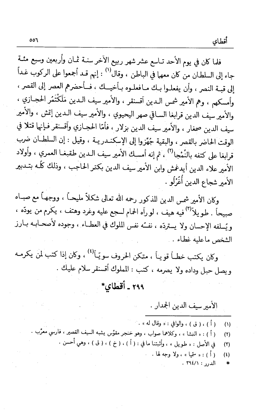 وكان الأمير شمس الدين المذكور رحمه الله تعالى شكلاً مليحاً، ووجهاً مع صباه صبيحاً. طويلاً فيه هيف، لو رآه الحمام لسجع عليه وغرد وهتف، يكرم من يودّه، ويُسلفه الإحسان ولا يستردُه، نفسه نفس الملوك في العطاء، وجوده لأصحابه بارز الشخص ما عليه غطاء.