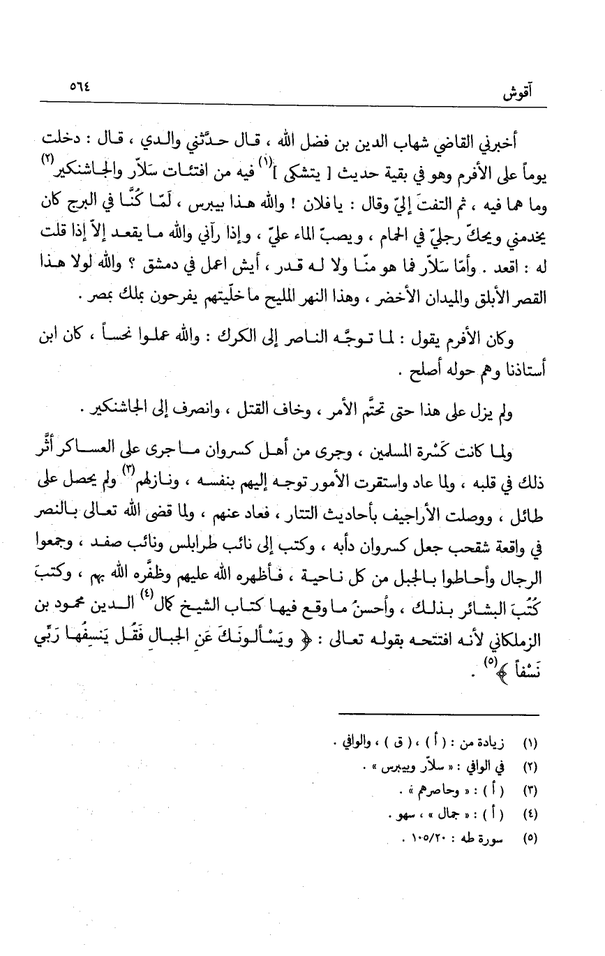 أخبرني القاضي شهاب الدين بن فضل الله، قال حدثني والدي، قال: دخلت يوماً على الأفرم وهو في بقية حديث يتشكى فيه من افتئات سلار والجاشنكير وما هما فيه، ثم التفت إلي وقال: يا فلان! والله هذا بيبرس، لما كنا في البرج كان يخدمني ويحكّ رجلي في الحمام، ويصبّ الماء علي، وإذا رآني والله ما يقعد إلاّ إذا قلت له: اقعد. وأمّا سلار فما هو منا ولا له قدر، أيش أعمل في دمشق؟ والله لولا هذا القصر الأبلق والميدان الأخضر، وهذا النهر المليح ما خلّيتهم يفرحون بملك بمصر.