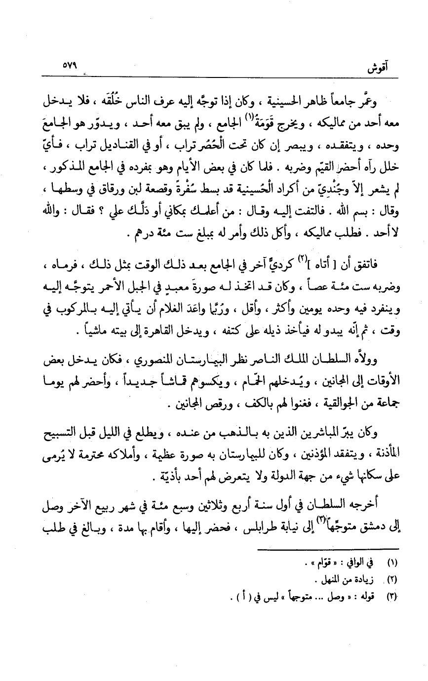 فاتفق أن أتاه كرديّ آخر في الجامع بعد ذلك الوقت بمثل ذلك، فرماه، وضربه ست مئة عصاً، وكان قد اتخذ له صورة معبدٍ في الجبل الأحمر يتوجّه إليه وينفرد فيه وحده يومين وأكثر، وأقل، ورُبّما واعَدَ الغلام أن يأتي إليه بالمركوب في وقت، ثم إنه يبدو له فيأخذ ذيله على كتفه، ويدخل القاهرة إلى بيته ماشياً.