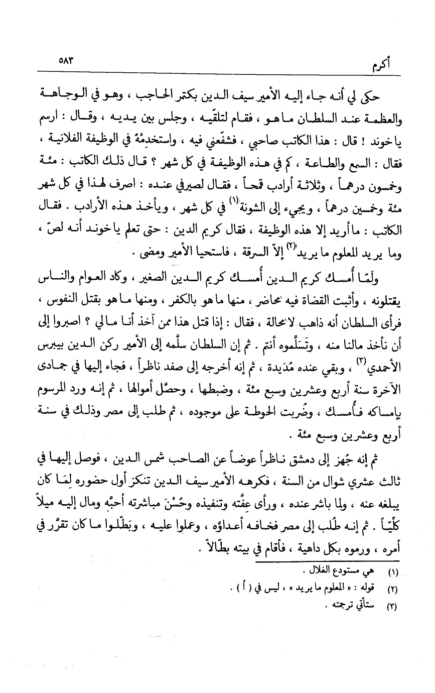 حكى لي أنه جاء إليه الأمير سيف الدين بكتمر الحاجب، وهو في الوجاهة والعظمة عند السلطان ما هو، فقام لتلقّيه، وجلس بين يديه، وقال: ارسم يا خوند! قال: هذا الكاتب صاحبي، فشفّعني فيه، واستخدِمْه في الوظيفة الفلانية، فقال: السمع والطاعة، كم في هذه الوظيفة في كل شهر؟ قال ذلك الكاتب: مئة وخمسون درهماً، وثلاثة أرداب قمحاً، فقال لصيرفي عنده: اصرف لهذا في كل شهر مئة وخمسين درهماً، ويجيء إلى الشونة في كل شهر، ويأخذ هذه الأرداب. فقال الكاتب: ما أريد إلا هذه الوظيفة، فقال كريم الدين: حتى تعلم يا خوند أنه لصّ، وما يريد المعلوم ما يريد إلاّ السرقة، فاستحيا الأمير ومضى.