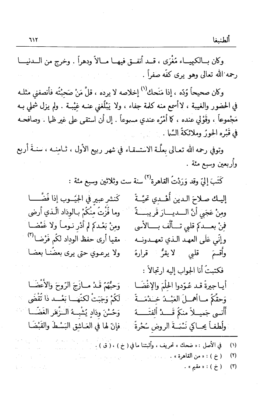 وكان صحيحاً وده، منحك إخلاصه لا يرده، قل من صحبته فأنصفني مثله في الحضور والغيبة، لا أسمع منه كلمة جفاء، ولا يبلغني عنه غيبة. ولم يزل شملي به مجموعاً، وقولي عنده، كنا أمره عندي مسموعاً. إلى أن استقى على غير ظما. وصافحه في قبره الحور وملائكة السَّما.
