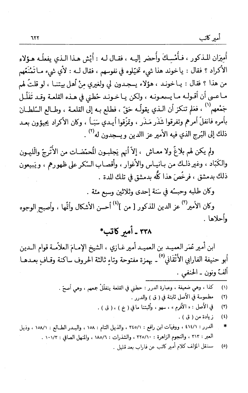 أميرَان المذكور، فأُمسِك وأُحضر إليه، فقال له: أيْش هذا الذي يفعله هؤلاء الأكراد؟ فقال: يا خوند هذا شيء تخيّلوه في نفوسهم، فقال له: لأي شيء ما تمْنَعُهم من هذا؟ فقال: يا خوند، هؤلاء يسجدون لي ولغيري من أهل بيتنا، لو قلتُ لهم ما عسى أن أقوله ما يسمعونه، ولكن يا خوند حُطني في هذه القلعة وقد تفلَّل جَمعهم، فعلم تنكز أن الذي يقوله حق، فطلع بع إلى القلعة، وطالع السلطان بأمره فانفلّ أمرهم وتفرقوا شَذَر مذَر، وتمزّقوا أيدي سَبَأ، وكان الأكراد يجيؤون بعد ذلك إلى البُرج الذي فيه الأمير عز الدين ويسجدون له.