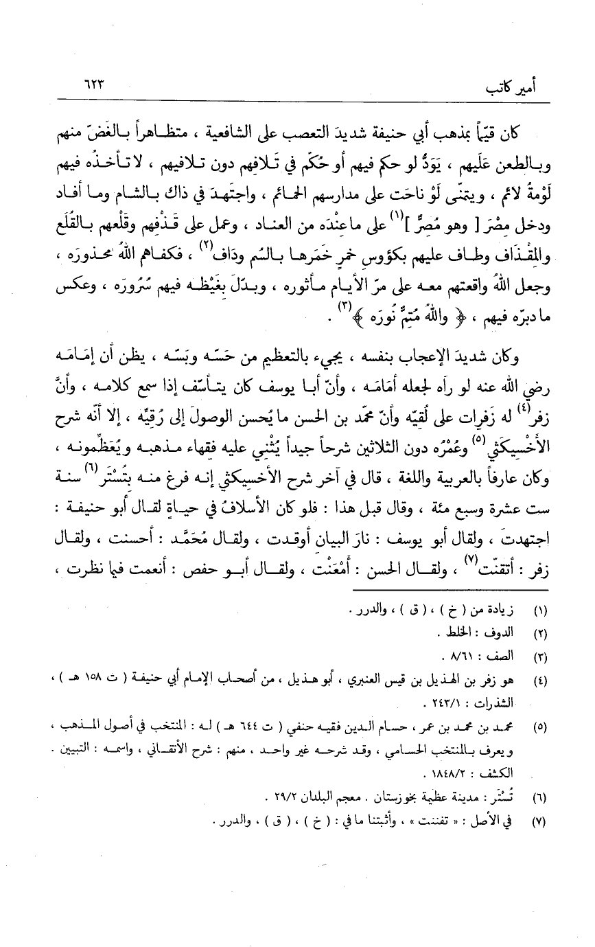 وكان شديد الإعجاب بنفسه، يجيء بالتعظيم من حَسّه وبَسّه، يظن أن إمامه رضي الله عنه لو رآه لجعله أمامه، وأنّ أبا يوسف كان يتأسف إذا سمع كلامه، وأنّ زفر له زفرات على لُقِيّه وأن محمد بن الحسن ما يُحسن الوصول إلى رُقيِّه، إلا أنه شرح الأخْسِيكَثي وعُمْرُه دون الثلاثين شرحاً جيداً يُثني عليه فقهاء مذهبه ويُعظّمونه، وكان عارفاً بالعربية واللغة، قال في آخر شرح الأخسِيكثي إنه فرغ منه بتُسْتَر سنة ست عشرة وسبع مئة، وقال قبل هذا: فلو كان الأسلاف في حياةٍ لقال أبو حنيفة: اجتهدتَ، ولقال أبو يوسف: نارَ البيان أوقدت، ولقال محمد: أحسنت، ولقال زفر: أتقنّت، ولقال الحسن: أمعَنْت، ولقال أبو حفص: أنعمت فيما نظرت،