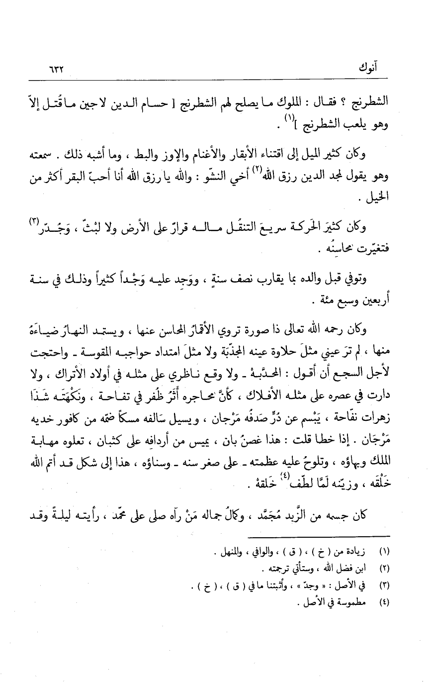 وكان رحمه الله تعالى ذا صورة تروي الأقمارُ المحاسن عنها، ويستمد النهارُ ضياءَه منها، لم ترَ عيني مثلَ حلاوة عينه المجذّبة ولا مثلَ امتداد حواجبه المقوسة - واحتجت لأجل السجع أن أقول: المحدَّبة - ولا وقع ناظري على مثله في أولاد الأتراك، ولا دارت في عصره على مثله الأفلاك، كأنّ محاجره أثَرُ ظُفر في تفاحة، ونَكْهَتَه شَذا زهرات نفّاحة، يَبْسم عن دُرٍّ صَدفُه مَرْجان، ويسيل سالفه مسكاً ضمّه من كافور خديه مَرْجان. إذا خطا قلت: هذا غصنُ بان، يميس من أردافه على كثبان، تعلوه مهابة الملك وبهاؤه، وتلوحُ عليه عظمته - على صغر سنه - وسناؤه، هذا إلى شكل قد أتم الله خَلْقَه، وزيّنه لمّا لطّف خَلقهْ.