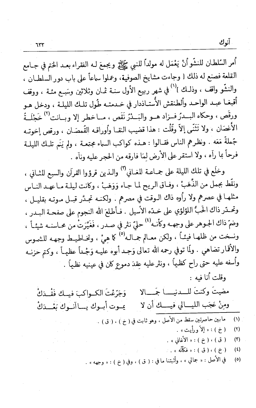وخلَع في تلك الليلة على جماعة المغاني والذين قرؤوا القرآن والسبع المثاني، ونقّط بجمل من الذهب، وفاق الريح لما جاء ووَهَبْ، وكانت ليلة ما عهد الناس مثلها في عصرهم ولا رأوه لك الوقت في مصرهم. ولكنه تجدّر قبل موته بقليل، وتحدّر ذاك الحبّ اللؤلؤي على خدّه الأسيل. فأطلع الله النجوم على صفحة البدر، وضمّ ذاك الجوهر على وجهه وكأنه حليّ نثر في صدر، فغَيَّرتْ من محاسنه شيئاً، ونسخت من ظلها فيئاً، ولكن معالم جماله كما هِيْ، وتخاطيط وجهه للشموس والأقمار تضاهي. ولمّا توفي رحمه الله تعالى وَجد أبوه عليه وَجْداً عظيماً، وكتم حزنه وأسفه عليه حتى راح كظيماً، ونثر عليه عِقدَ دموعٍ كان في عينيه نظيماً.
