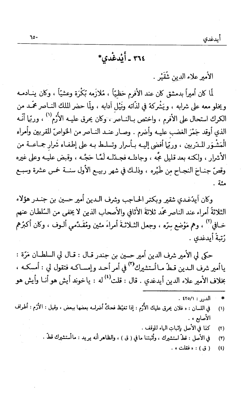 حكى لي الأمير شرف الدين أمير حسين بن جندر قال: قال لي السلطان مرة: يا أمير شرف الدين قطّ ما أستشيرك في أمر أحد وإمساكه فتقول لي: أمسكه، بخلاف الأمير علاء الدين أيدغدي. قال: قلت له: يا خوند أيش هو أنا وأيش هو