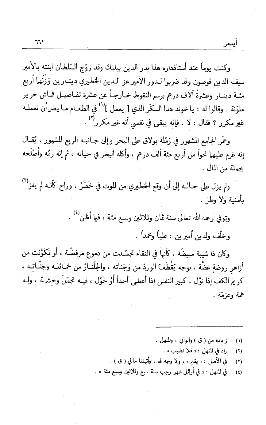 وكنت يوماً عند أستاذ داره هذا بدر الدين بيلبك وقد زوّج السلطان ابنته بالأمير سيف الدين قوصون وقد ضربوا لدور الأمير عز الدين الخطيري دينارين وزْنُهما أربع مئة دينار وعشرة آلاف درهم برسم النقوط خارجاً عن عشرة تفاصيل قماش حرير ملونة، وقالوا له: يا خوند هذا السكّر الذي يعمل في الطعام ما يضر أن نعمله غير مكرر؟ فقال: لا، فإنه يبقى في نفسي أنه غير مكرر.
