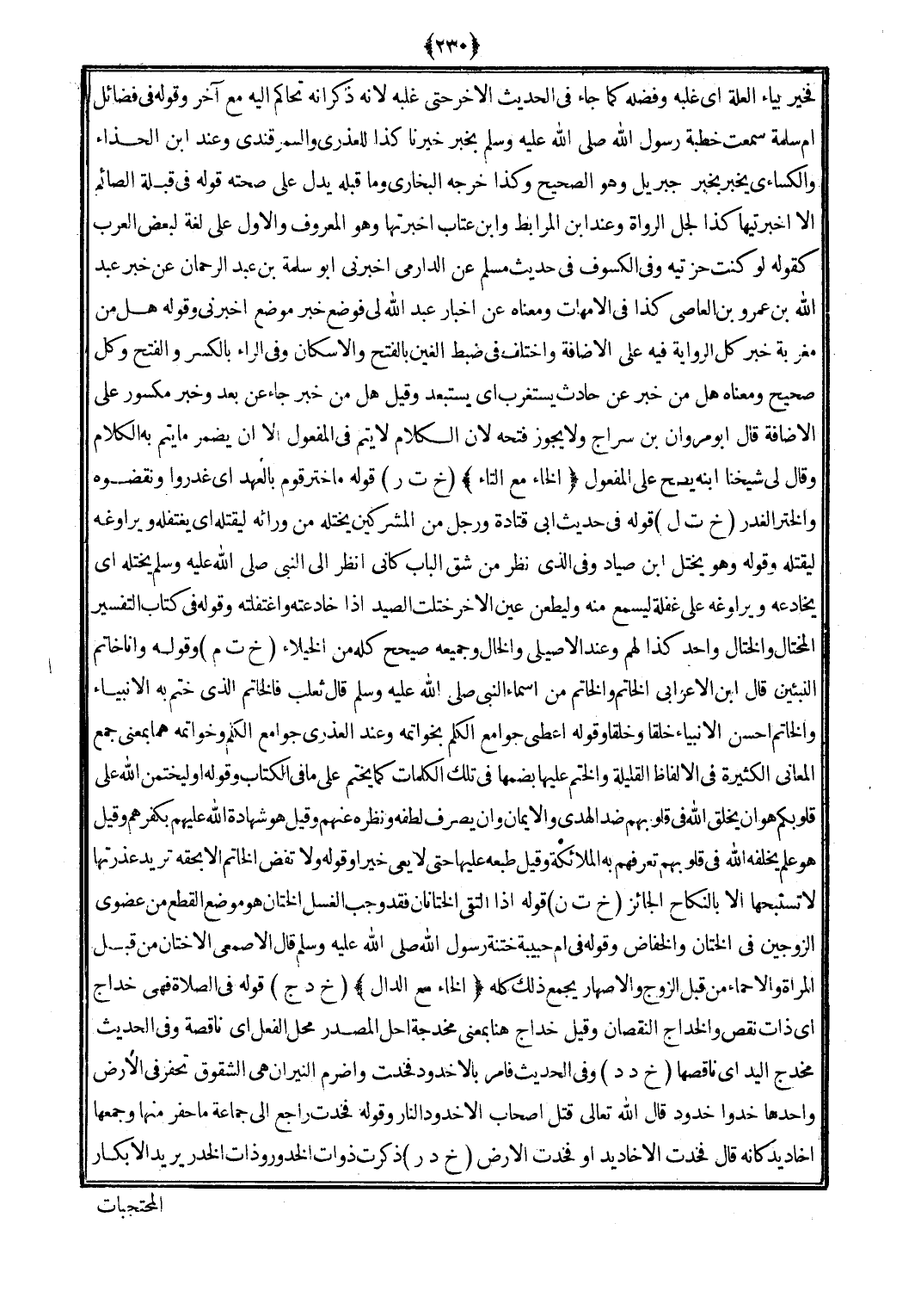 فَخير بياء الْعلَّة أَي غَلبه وفضله كَمَا جَاءَ فِي الحَدِيث الآخر حَتَّى غَلبه لِأَنَّهُ ذكر أَنه تحاكم إِلَيْهِ مَعَ آخر وَقَوله فِي فَضَائِل أم سَلمَة سَمِعت خطْبَة رَسُول الله (صلى الله عَلَيْهِ وَسلم) بِخَبَر خيرنا كَذَا للعذري والسمرقندي وَعند ابْن الْحذاء وَالْكسَائِيّ يخبر بِخَبَر جِبْرِيل وَهُوَ الصَّحِيح وَكَذَا خرجه البُخَارِيّ وَمَا قبله يدل على صِحَّته قَوْله فِي قبْلَة الصَّائِم إِلَّا أخبرتيها كَذَا لجل الروَاة وَعند ابْن المرابط وَابْن عتاب أخْبرتهَا وَهُوَ الْمَعْرُوف وَالْأول على لُغَة لبَعض الْعَرَب كَقَوْلِه لَو كنت حُزْتِيهِ وَفِي الْكُسُوف فِي حَدِيث مُسلم عَن الدَّارمِيّ أَخْبرنِي أَبُو سَلمَة بن عبد الرَّحْمَن عَن خبر عبد الله بن عَمْرو بن العَاصِي كَذَا فِي الْأُمَّهَات وَمَعْنَاهُ عَن أَخْبَار عبد الله لي فَوضع خبر مَوضِع أَخْبرنِي وَقَوله هَل من مغربة خبر كل الرِّوَايَة فِيهِ على الْإِضَافَة وَاخْتلف فِي ضبط الْغَيْن بِالْفَتْح والإسكان وَفِي الرَّاء بِالْكَسْرِ وَالْفَتْح وكل صَحِيح وَمَعْنَاهُ هَل من خبر عَن حَادث يستغرب أَي يستبعد وَقيل هَل من خبر جَاءَ عَن بعد وَخبر مكسور على الْإِضَافَة قَالَ أَبُو مَرْوَان بن سراج وَلَا يجوز فَتحه لِأَن الْكَلَام لَا يتم فِي الْمَفْعُول إِلَّا أَن يضمر مَا يتم بِهِ الْكَلَام وَقَالَ لي شَيخنَا ابْنه يَصح على الْمَفْعُول