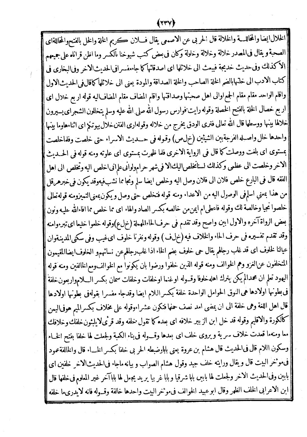 الْخلال أَيْضا والمخاللة والخلالة قَالَ الْحَرْبِيّ عَن الْأَصْمَعِي يُقَال فلَان كريم الْخلَّة والخل بِالْفَتْح والمخاللة أَي الصُّحْبَة وَيُقَال فِي الْمصدر خلالة وخلالة وخلولة وَكَانَ فِي بعض كتب شُيُوخنَا بِالْكَسْرِ وَمَا أَظن قرأناه على جَمِيعهم إِلَّا كَذَلِك وَفِي حَدِيث خَدِيجَة فيبعث إِلَى خلائلها أَي أصدقائها كَمَا جَاءَ مُفَسرًا فِي الحَدِيث الآخر وَفِي البُخَارِيّ فِي كتاب الْأَدَب إِلَى خلتها بِالضَّمِّ الْخلَّة الصاحب والخلة الصداقة والمودة يَعْنِي إِلَى خلائلها كَمَا قَالَ فِي الحَدِيث الأول وَأقَام الْوَاحِد مقَام مقَام الْجمع أَو إِلَى أهل صحبتهَا وصداقتها وَأقَام الْمُضَاف مقَام الْمُضَاف إِلَيْهِ قَوْله أَربع خلال أَي أَربع خِصَال الْخلَّة بِالْفَتْح الْخصْلَة وَقَوله رَأَيْت فوارس رَسُول الله (صلى الله عَلَيْهِ وَسلم) يتخللون الشّجر أَي يَسِيرُونَ خلالها بَينهَا ووسطها قَالَ الله تَعَالَى) فترى الودق يخرج من خلاله